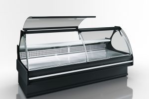 מדף קירור עם זכוכית כדורית המספק תצוגה מפורטת של סידור המוצרים, זמין במתכון זכוכית עצמי.