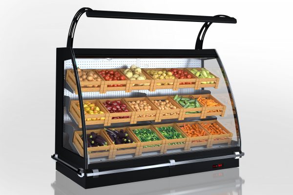 מעדנייה חצי-אנכית למכירת ירקות ופירות. המוצר כולל חיבור למערכת קירור מרחוק, קירור דינמי ועיצוב נטוי.