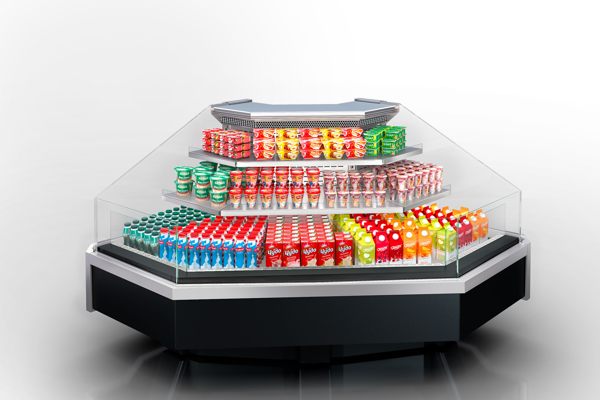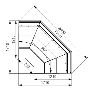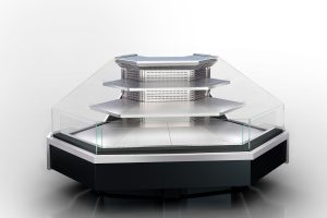 מקרר מעדניה עם אלמנטים בזווית שמיועד לתצוגת מזון. המוצר מתאפיין בקירור דינמי ומתחבר למערכת קירור מרחוק, תוך שימוש במאווררים חסכוניים באנרגיה.