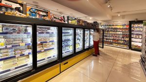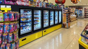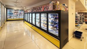 • מקרר נמוך טמפרטורה מסוג סמי-וורטיקל עם דלתות חסכוניות באנרגיה למוצרי קירור קפואים.