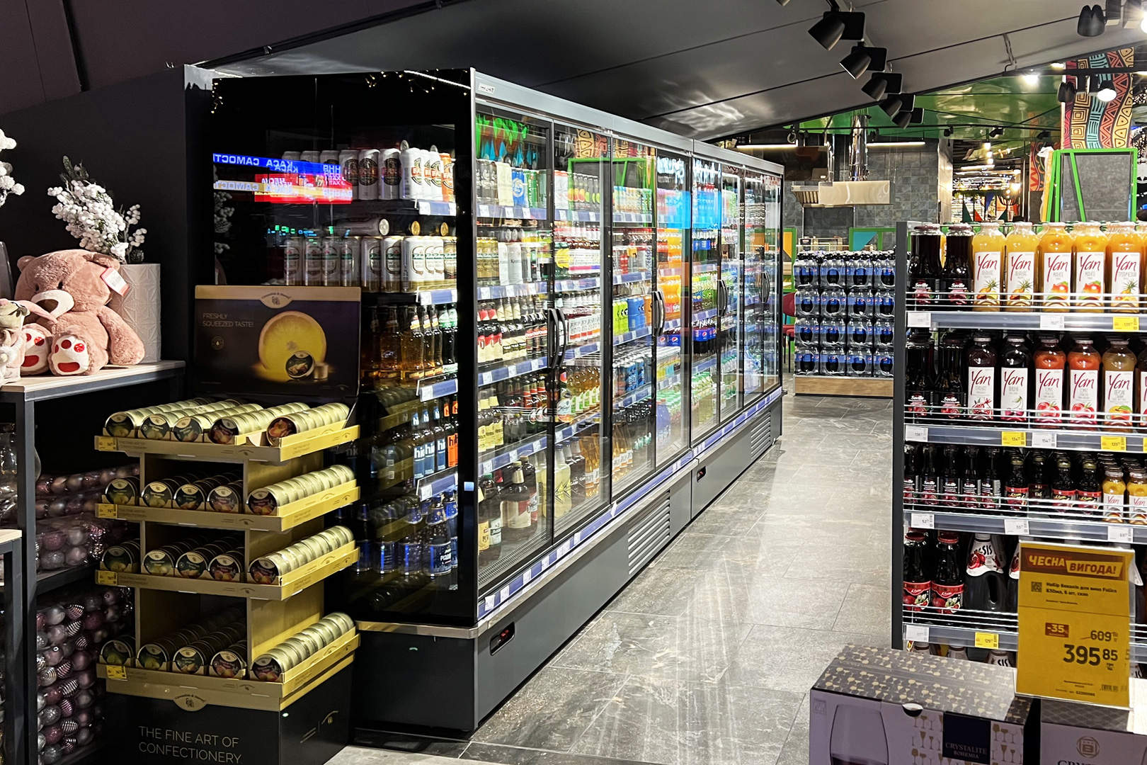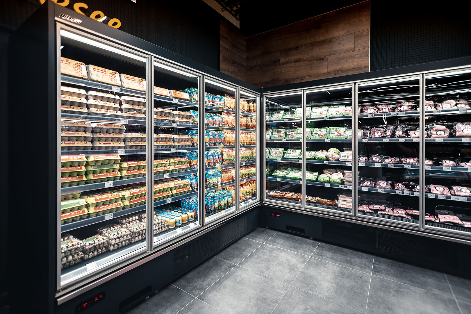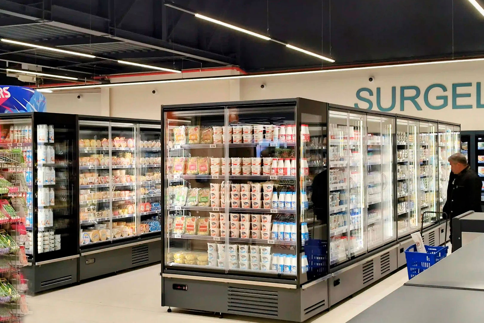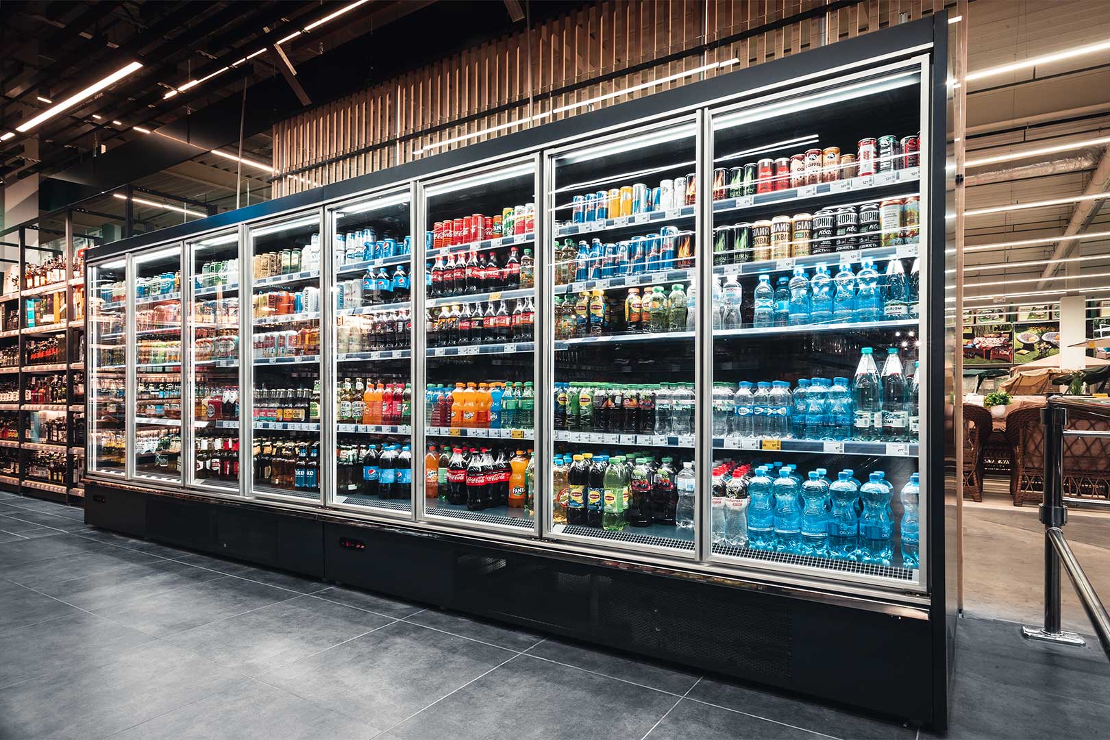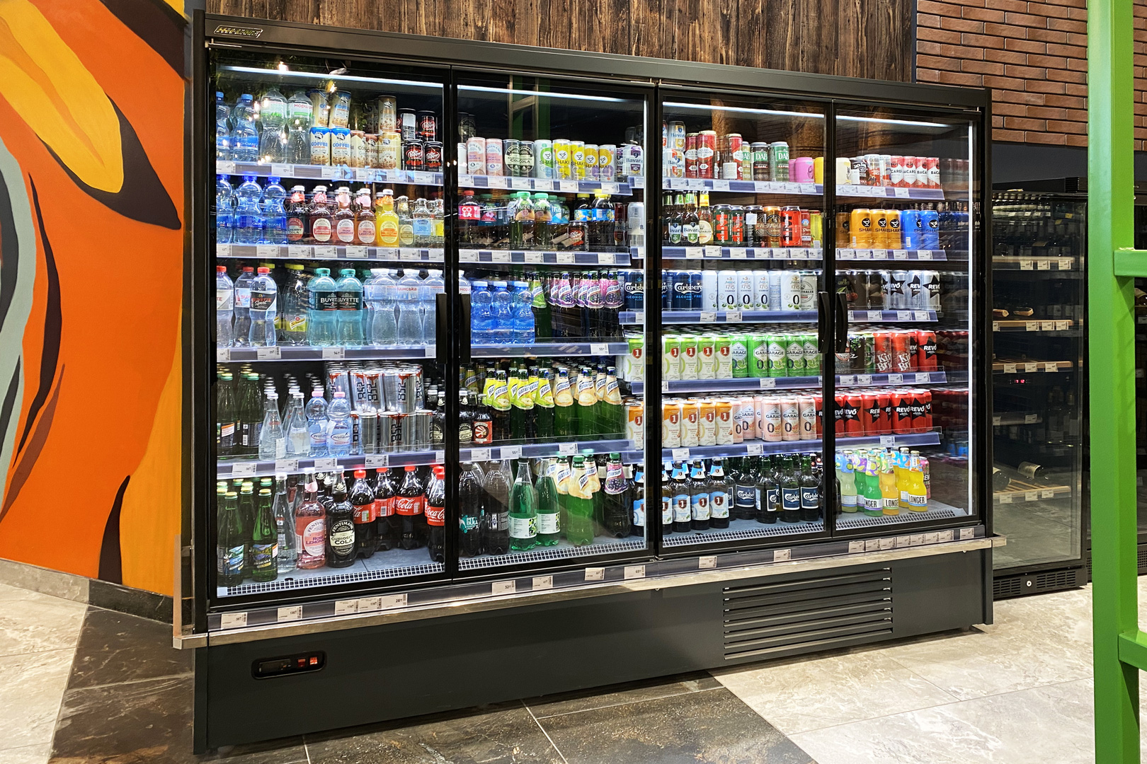 ארון קירור רב-שכבות עם דלתות חסכוניות באנרגיה, שמיועד לשימוש בחנויות מסוגים שונים.