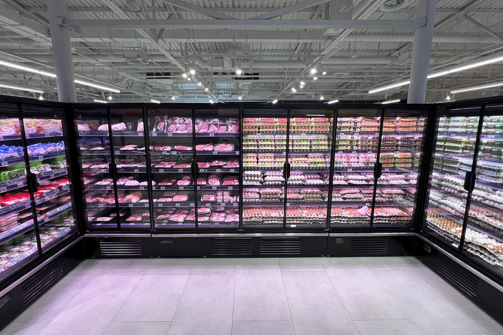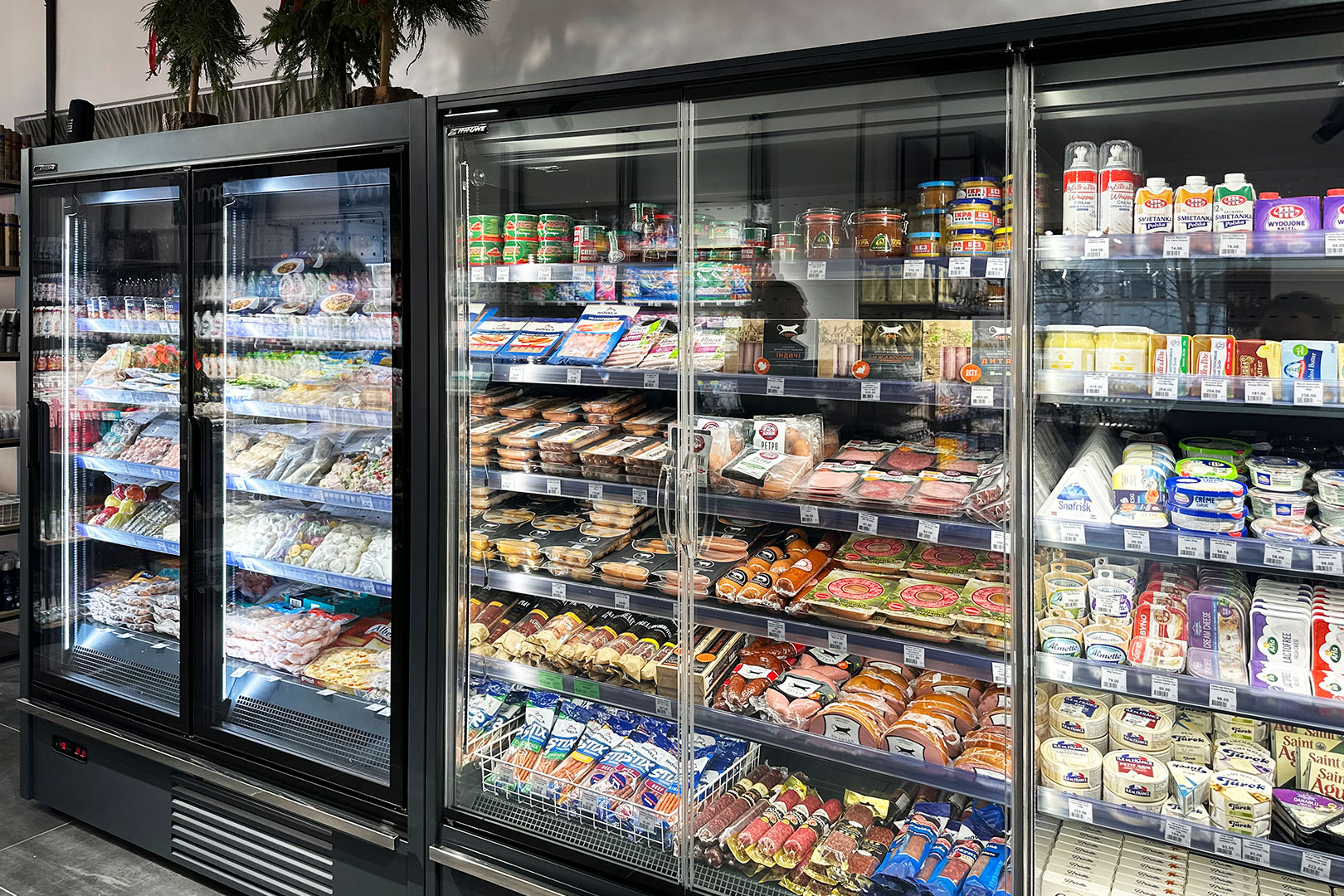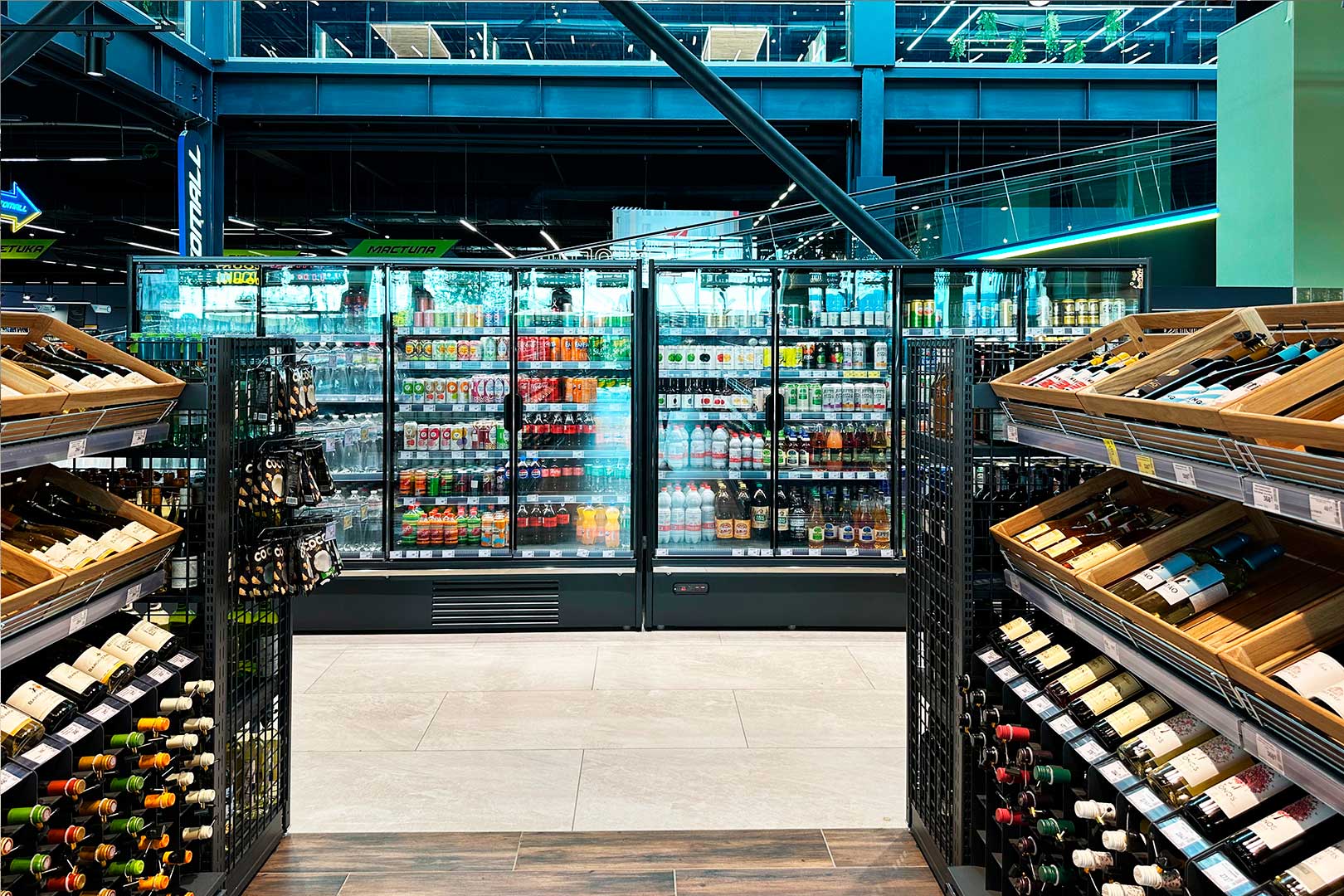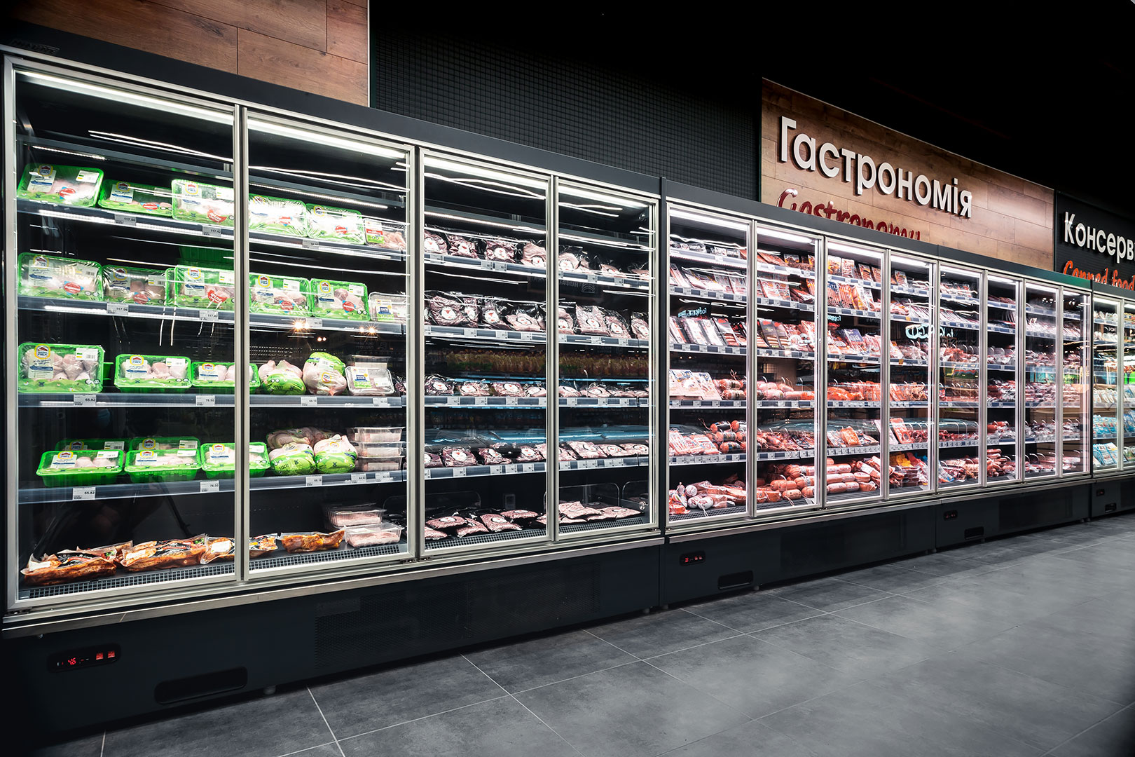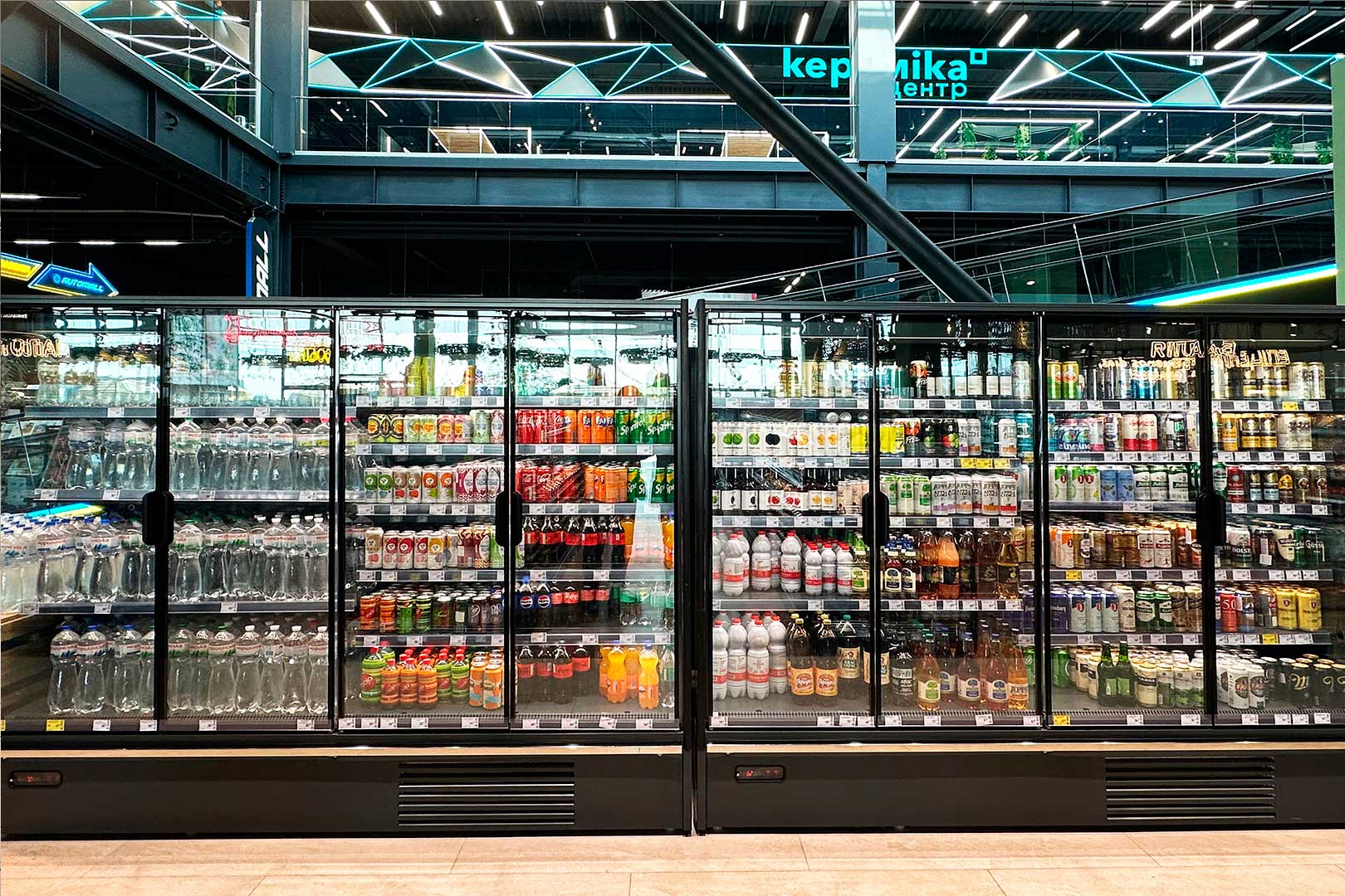 ארון קירור רב-שכבות עם דלתות חסכוניות באנרגיה, שמיועד לשימוש בחנויות מסוגים שונים.