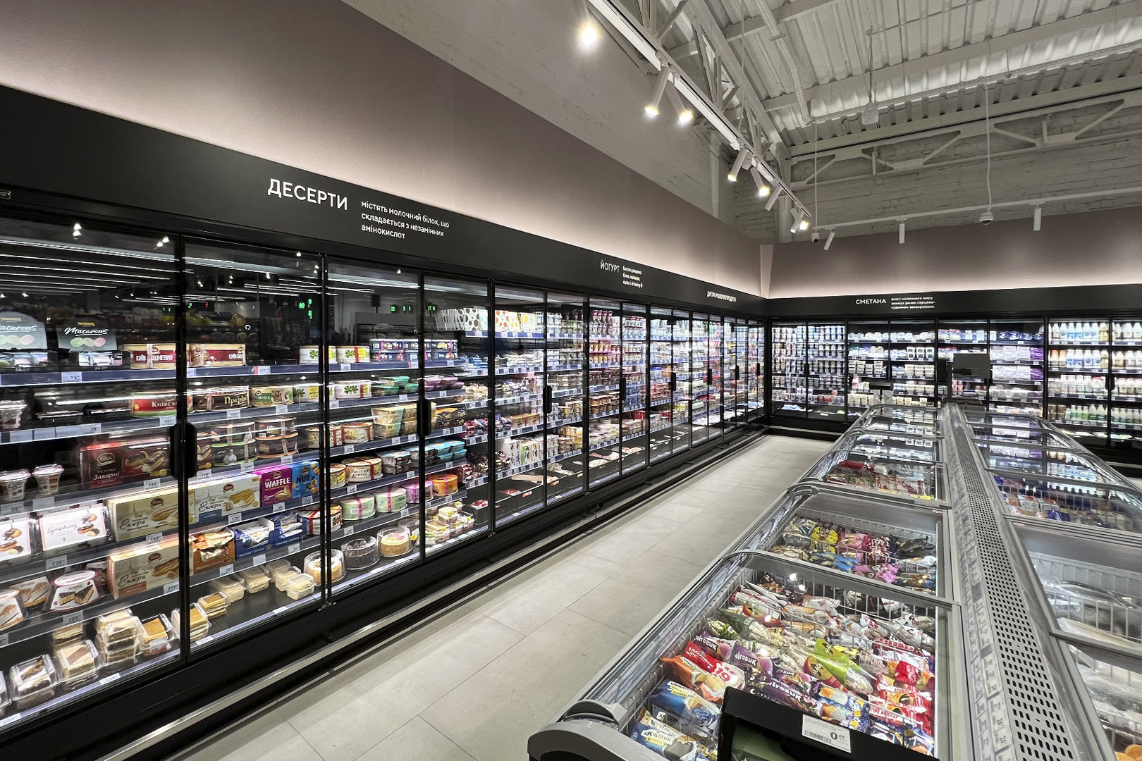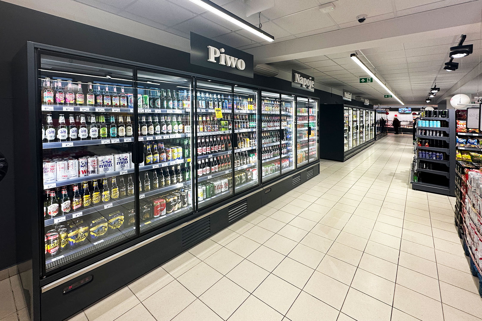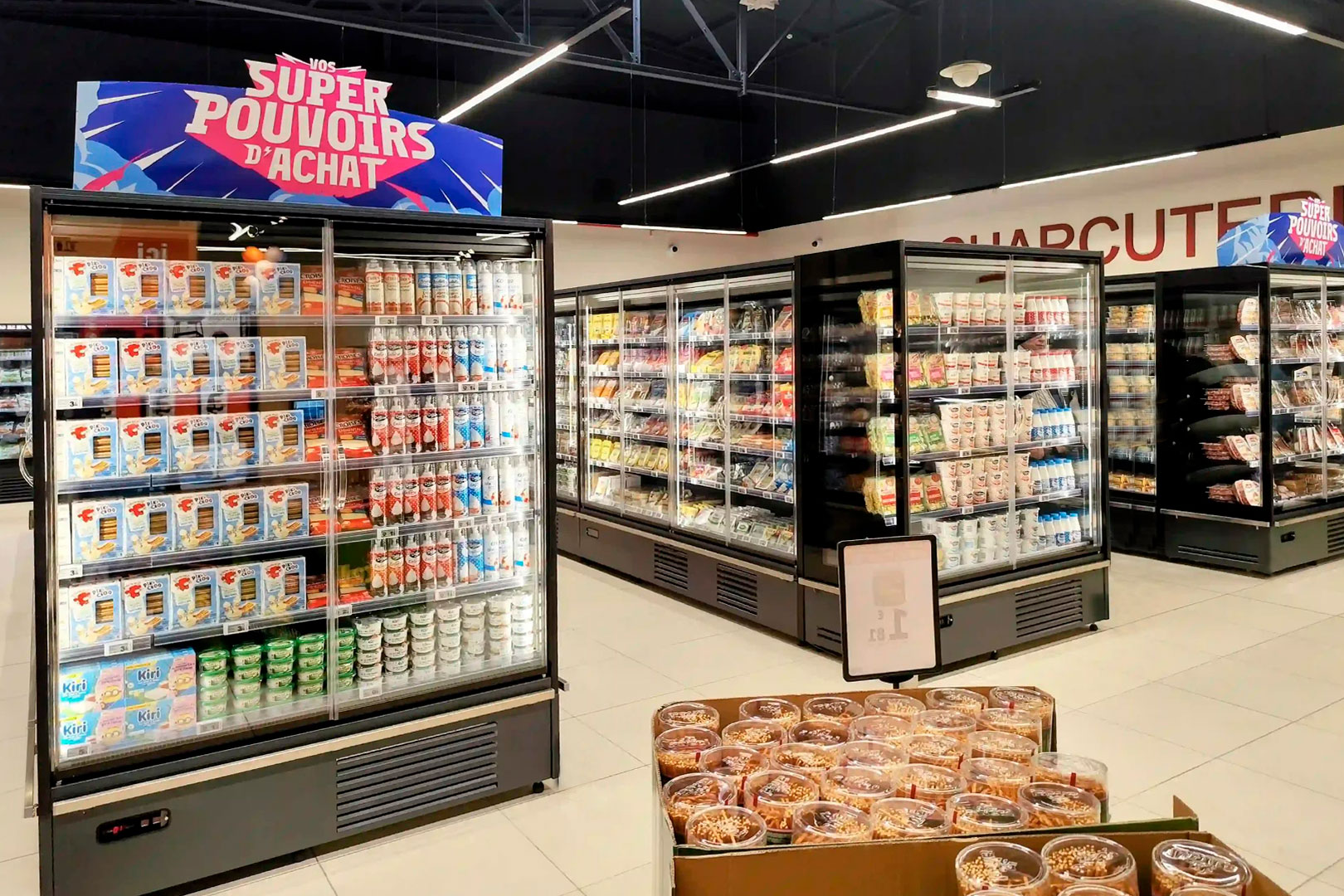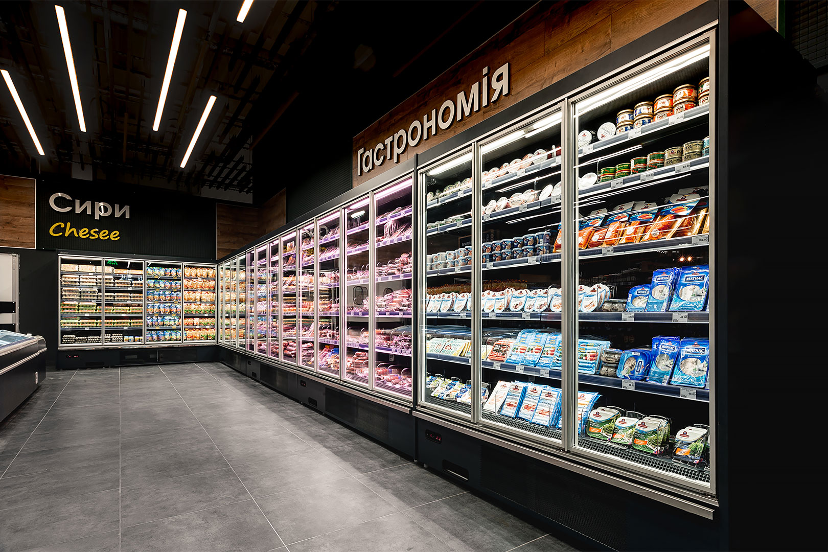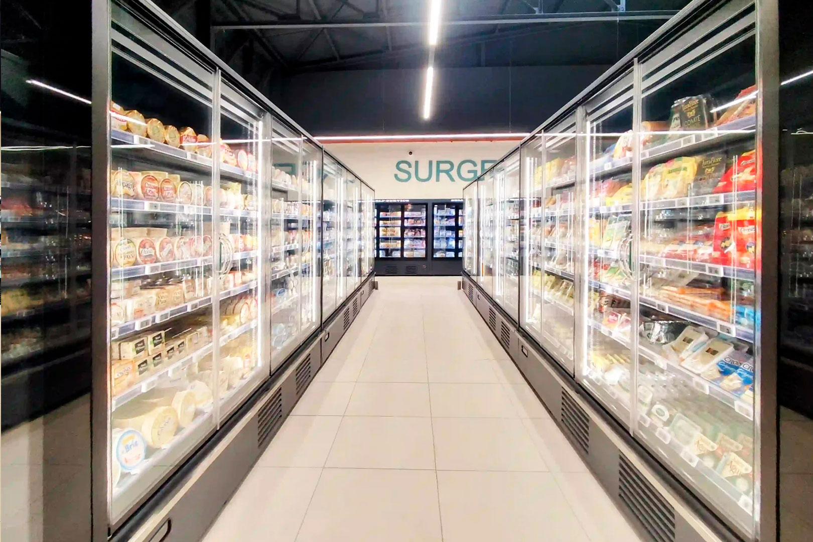 ארון קירור רב-שכבות עם דלתות חסכוניות באנרגיה, שמיועד לשימוש בחנויות מסוגים שונים.