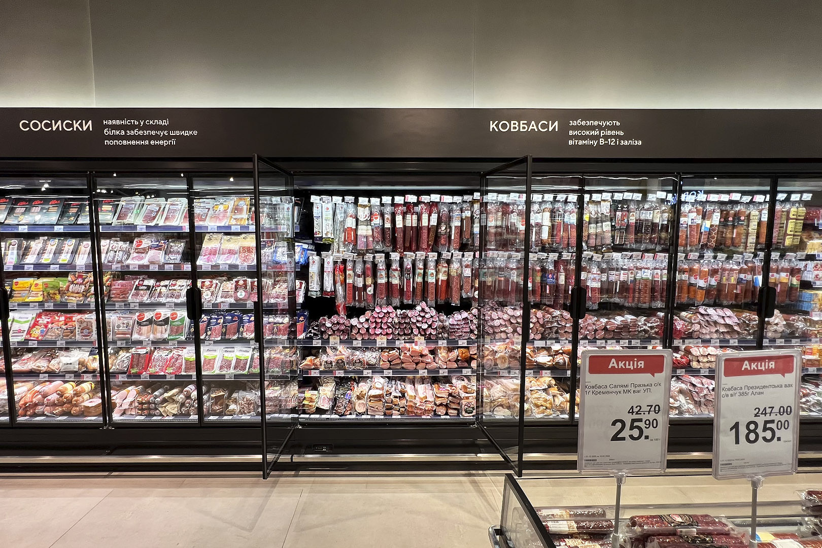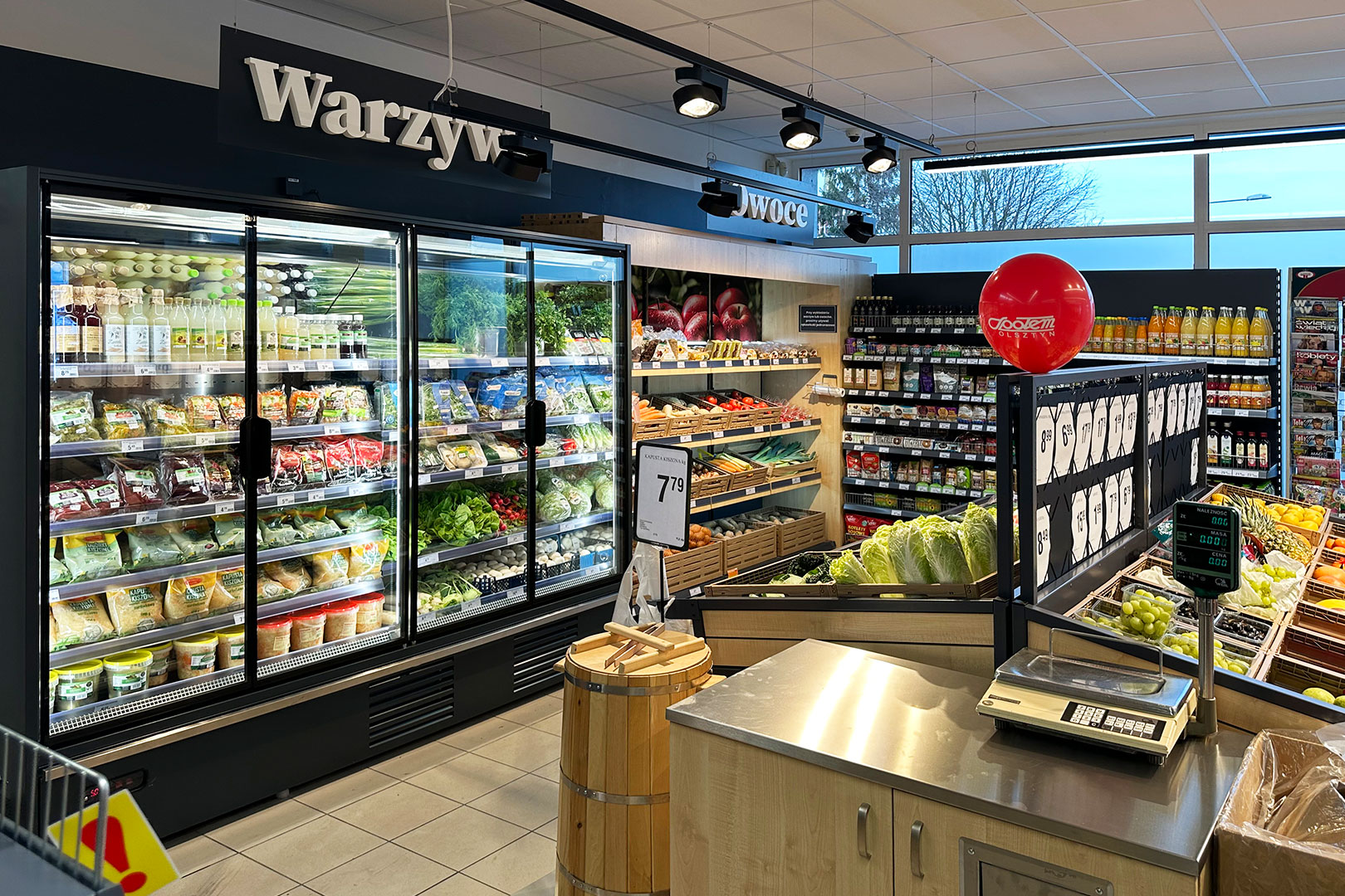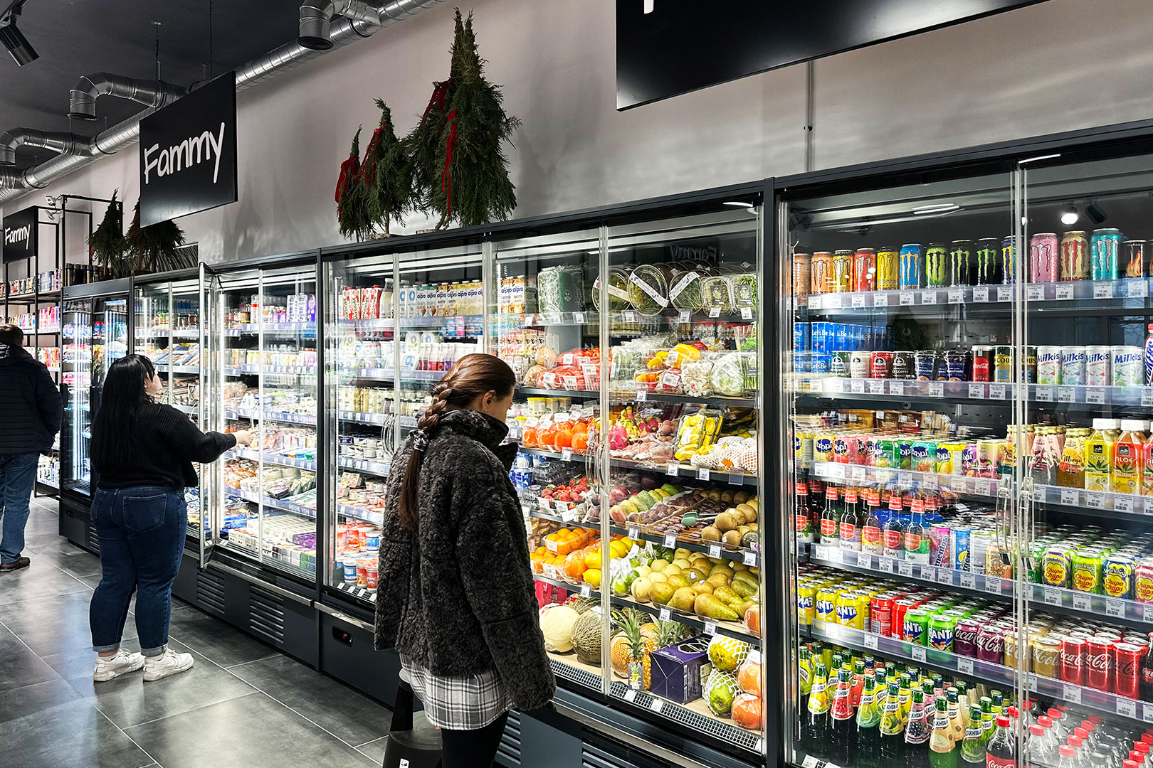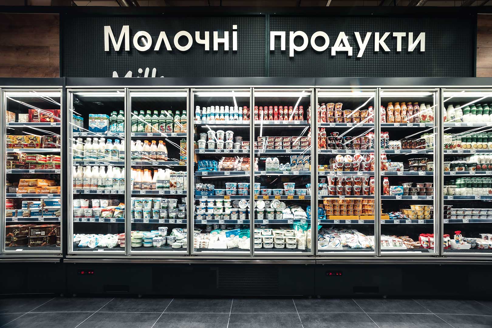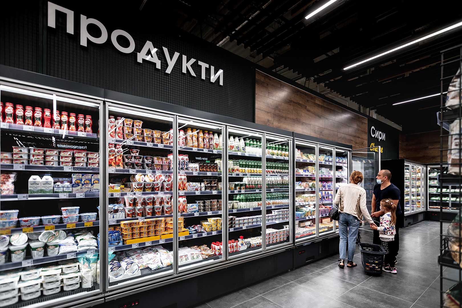 ארון קירור רב-שכבות עם דלתות חסכוניות באנרגיה, שמיועד לשימוש בחנויות מסוגים שונים.