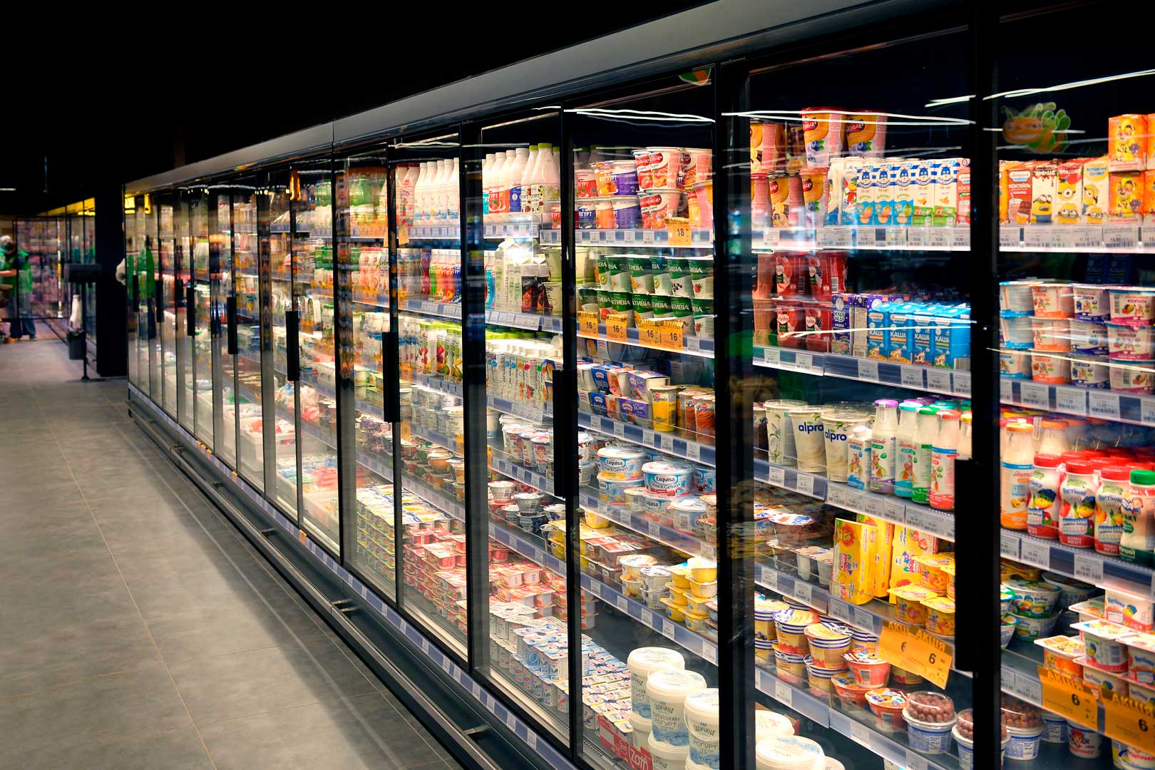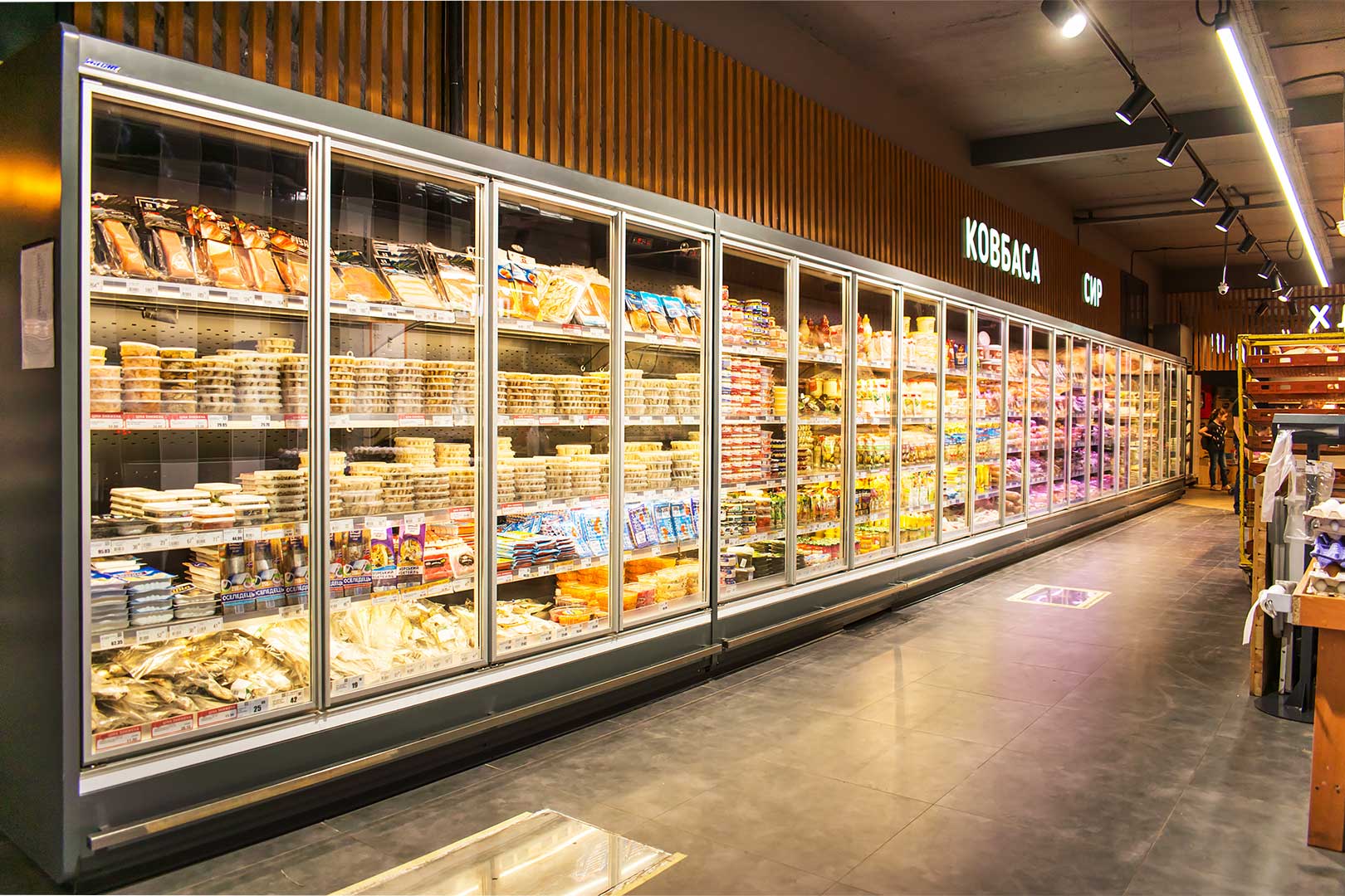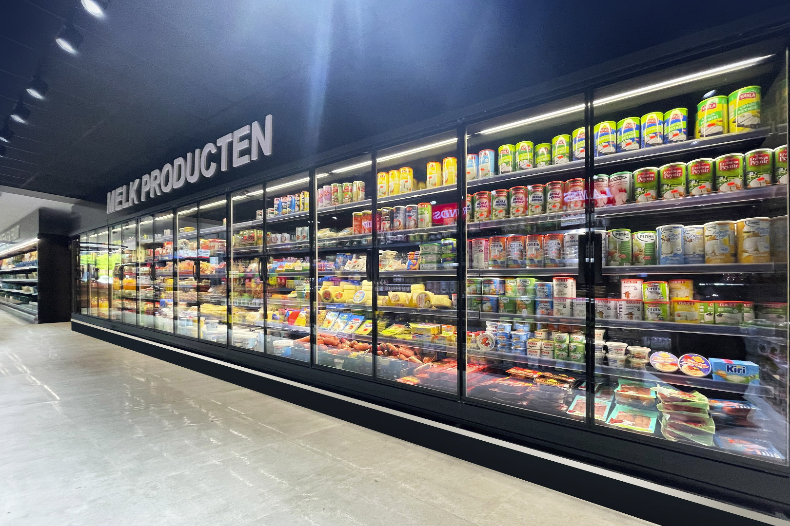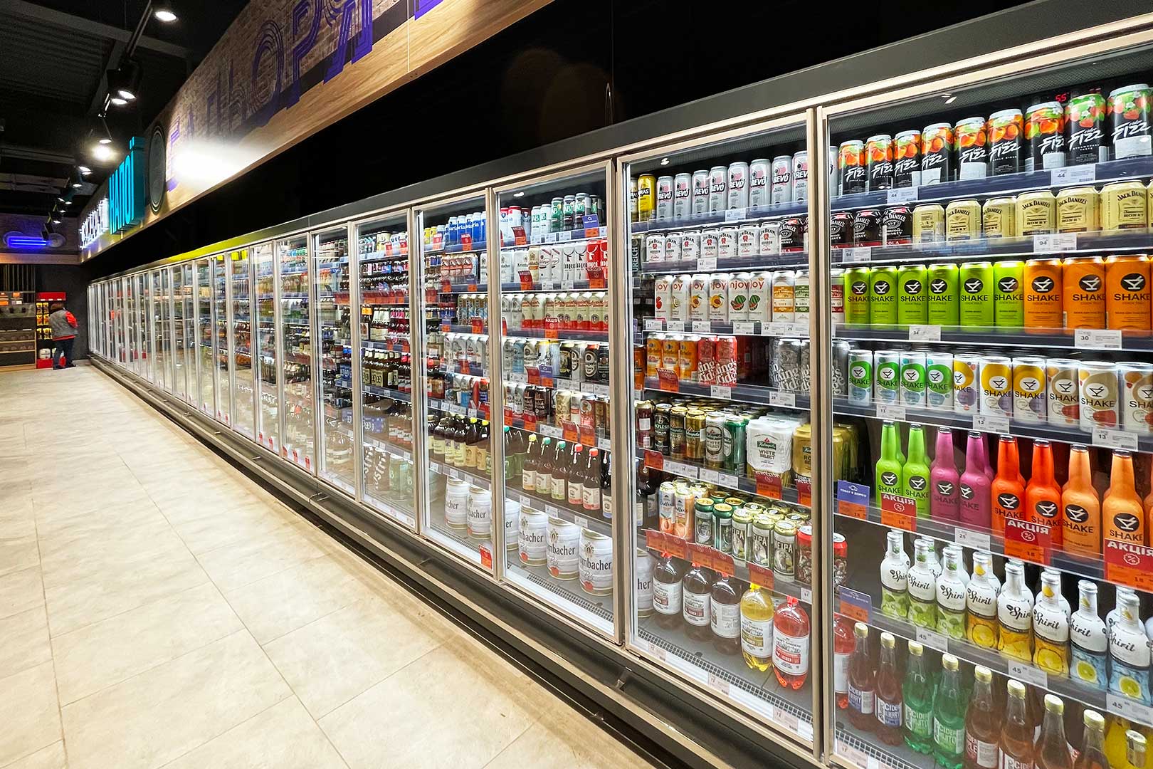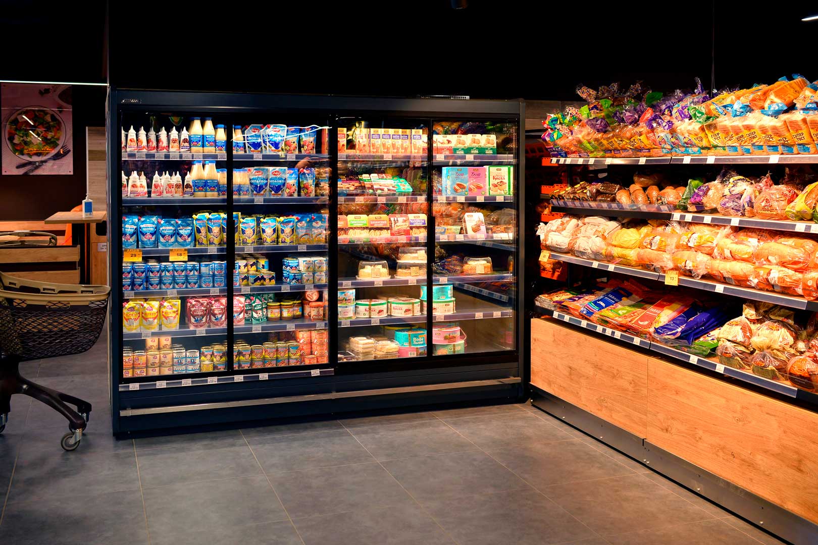 ארון מקרר רב-קומות עם דלתות חסכוניות באנרגיה, המתאים לכל פורמט חנות.