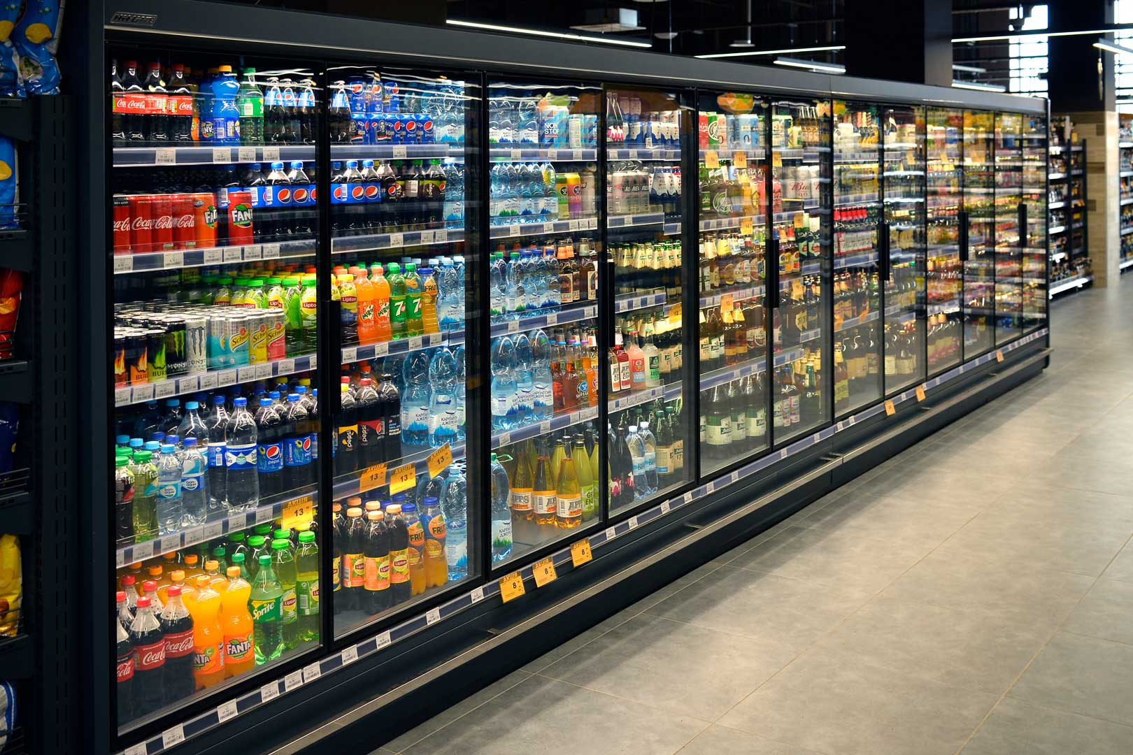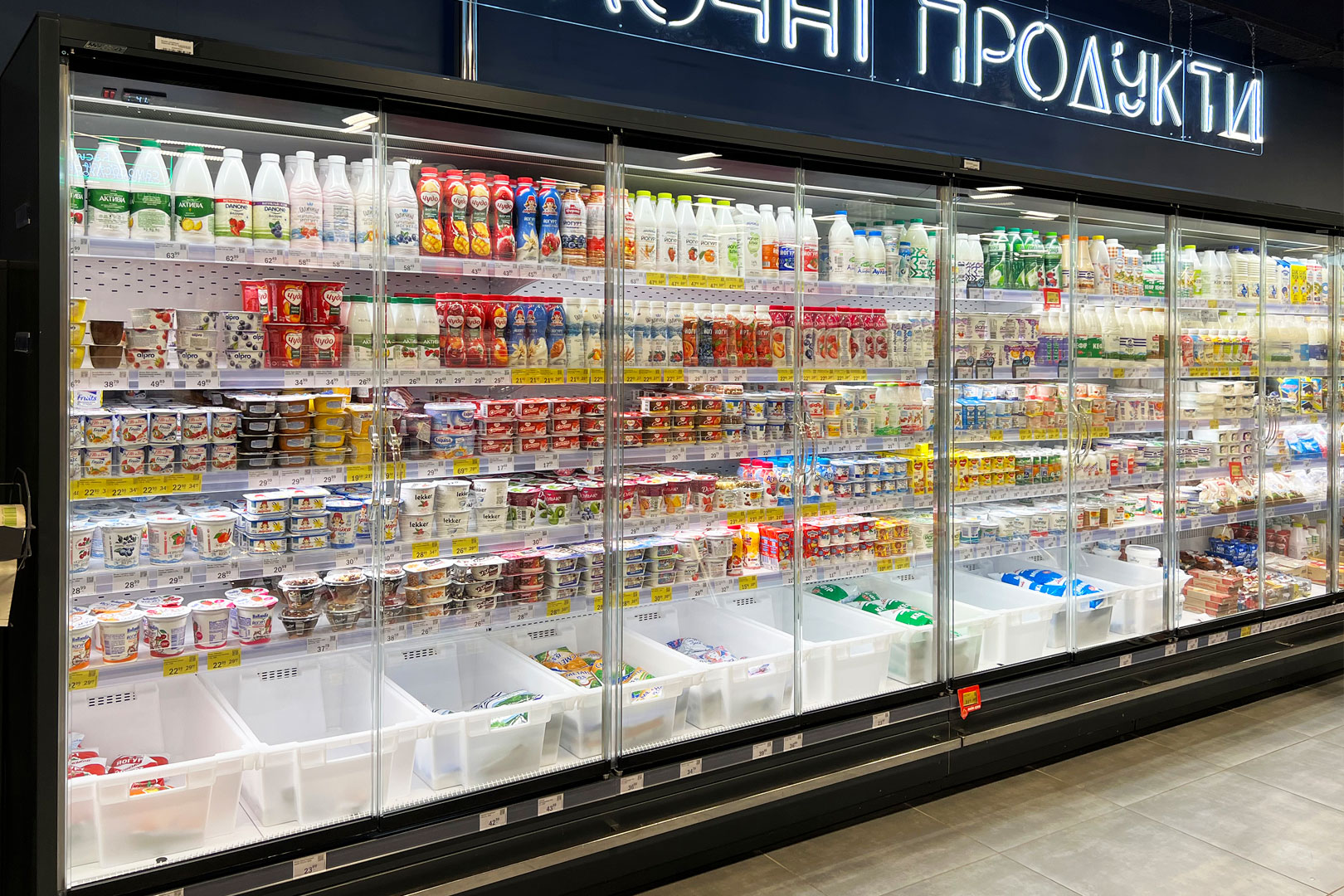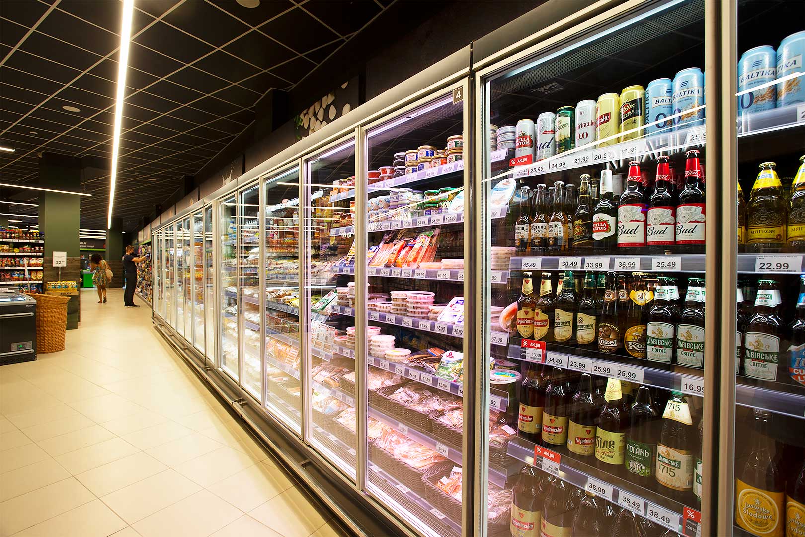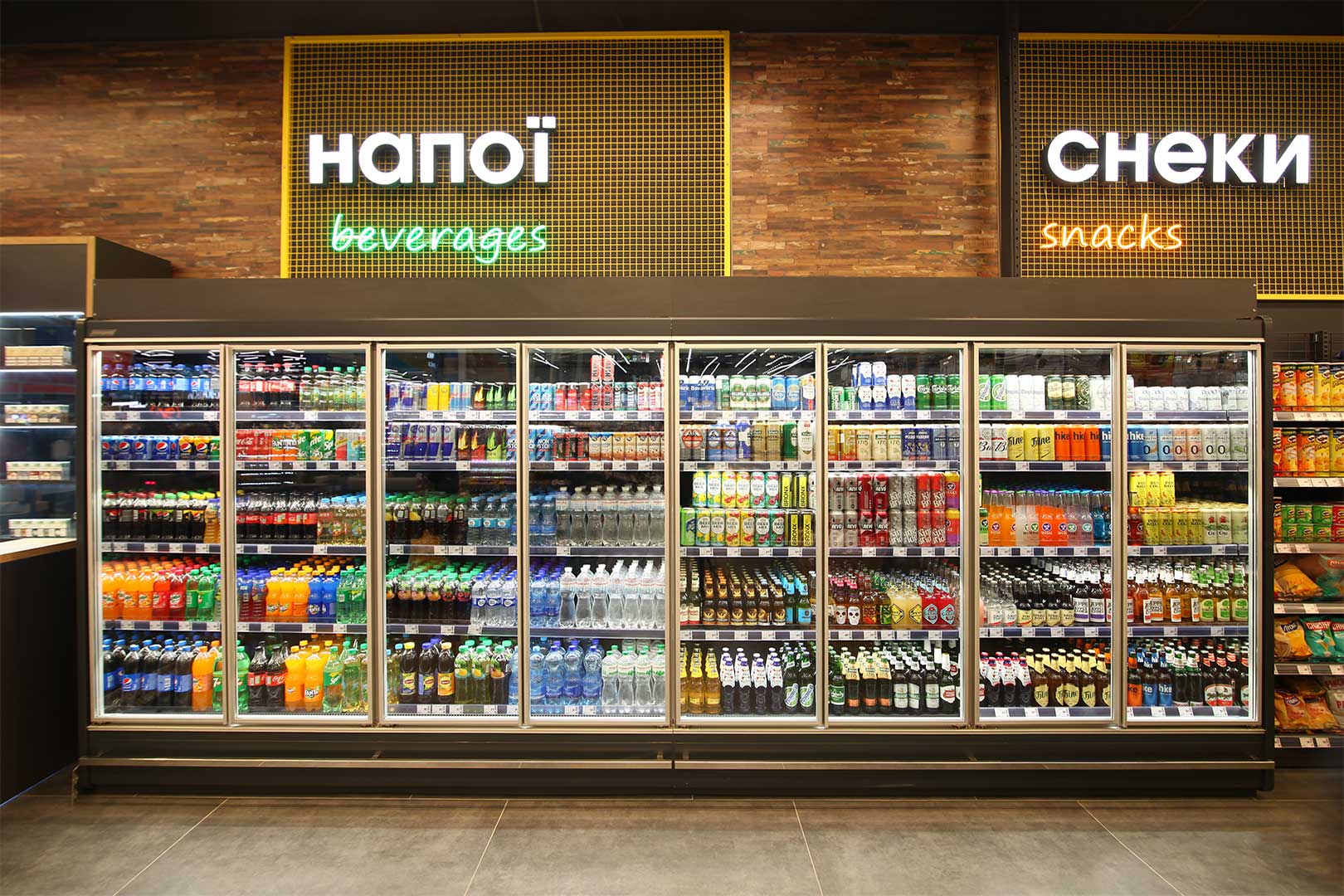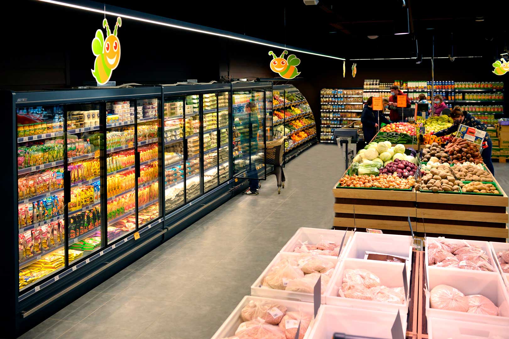 ארון מקרר רב-קומות עם דלתות חסכוניות באנרגיה, המתאים לכל פורמט חנות.