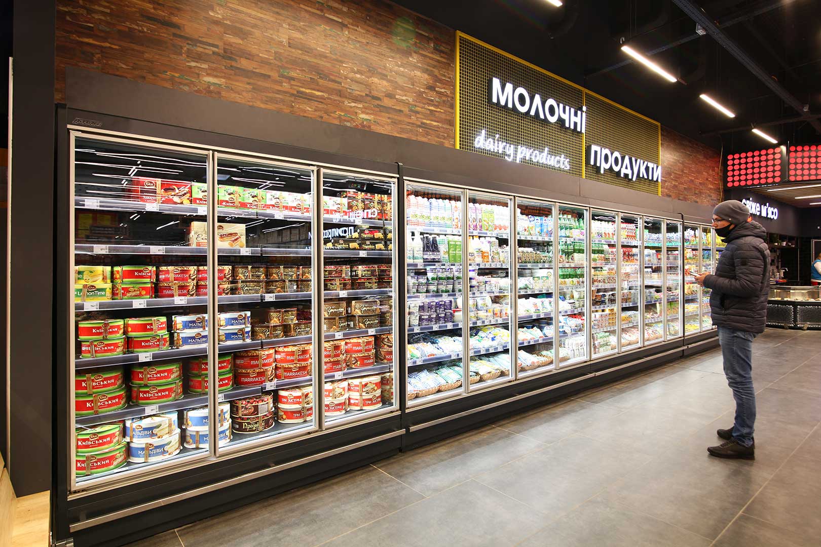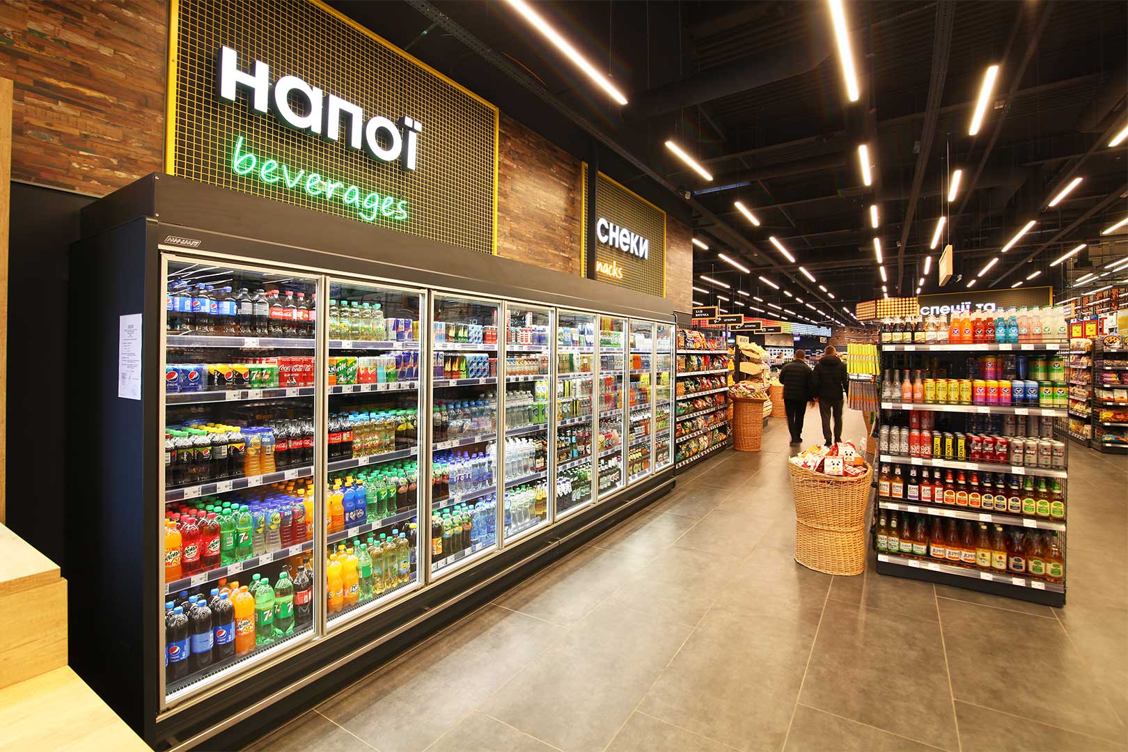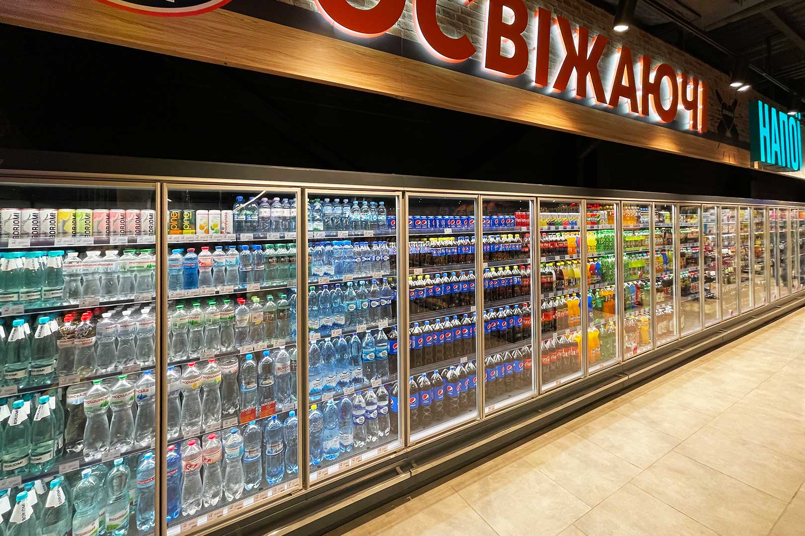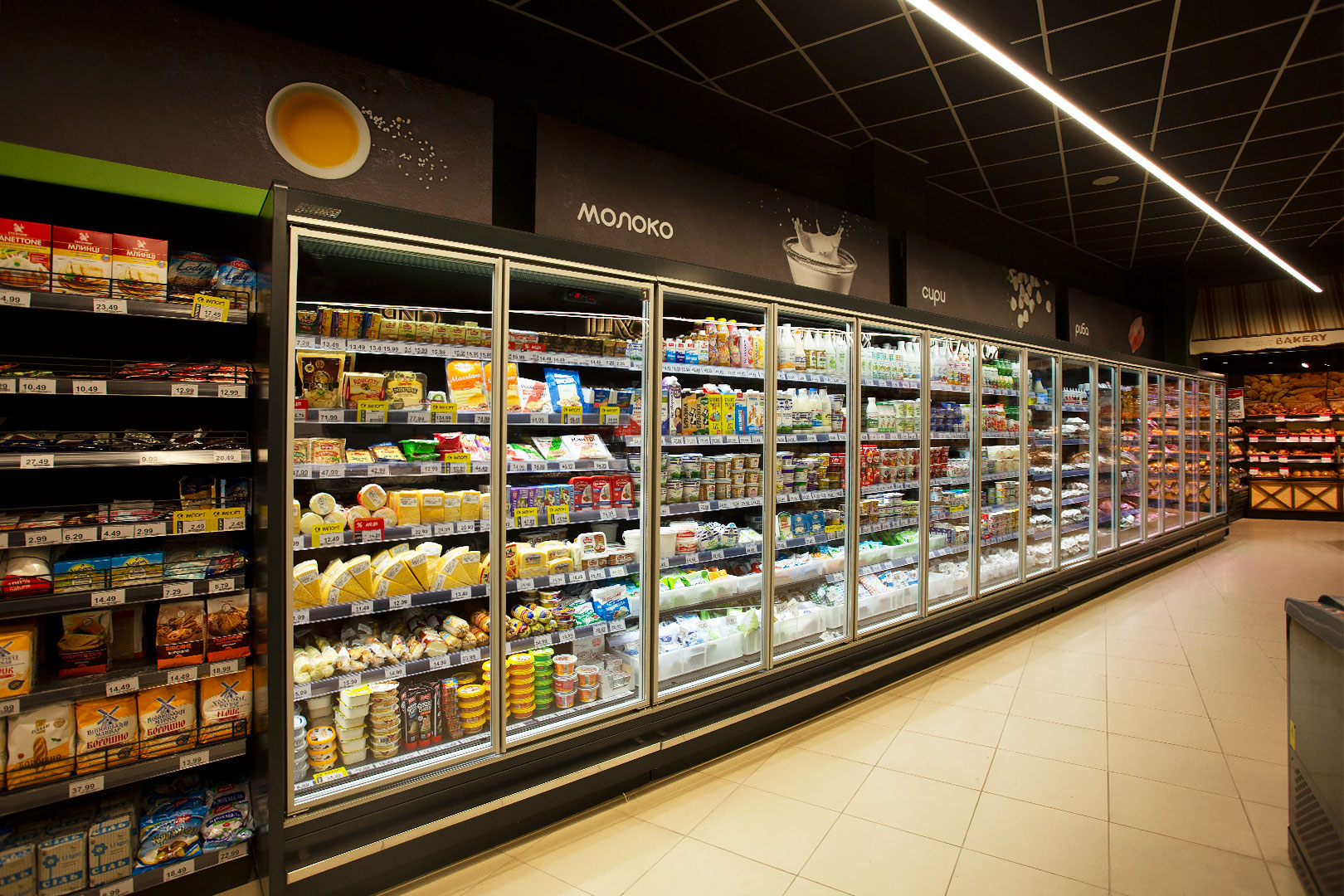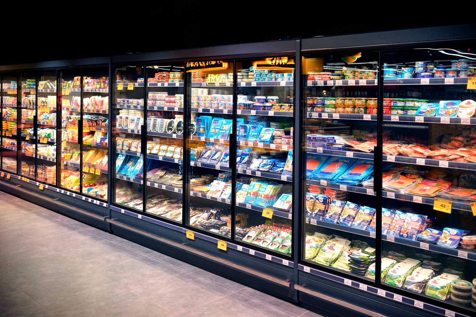 ארון מקרר רב-קומות עם דלתות חסכוניות באנרגיה, המתאים לכל פורמט חנות.