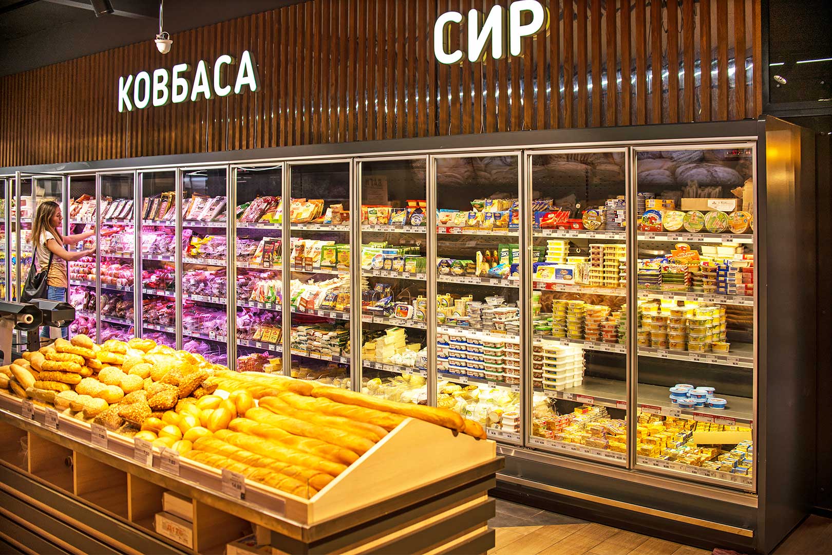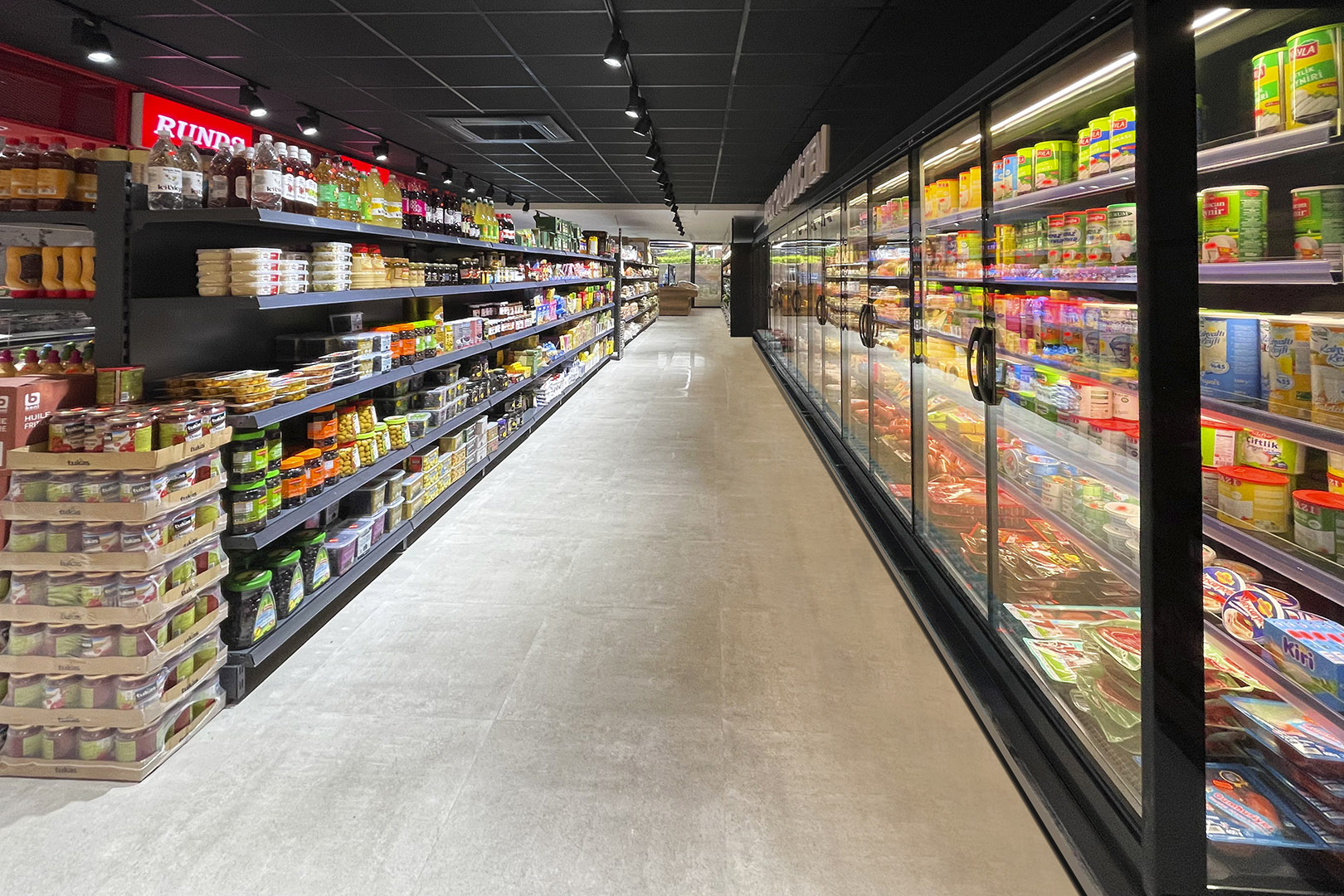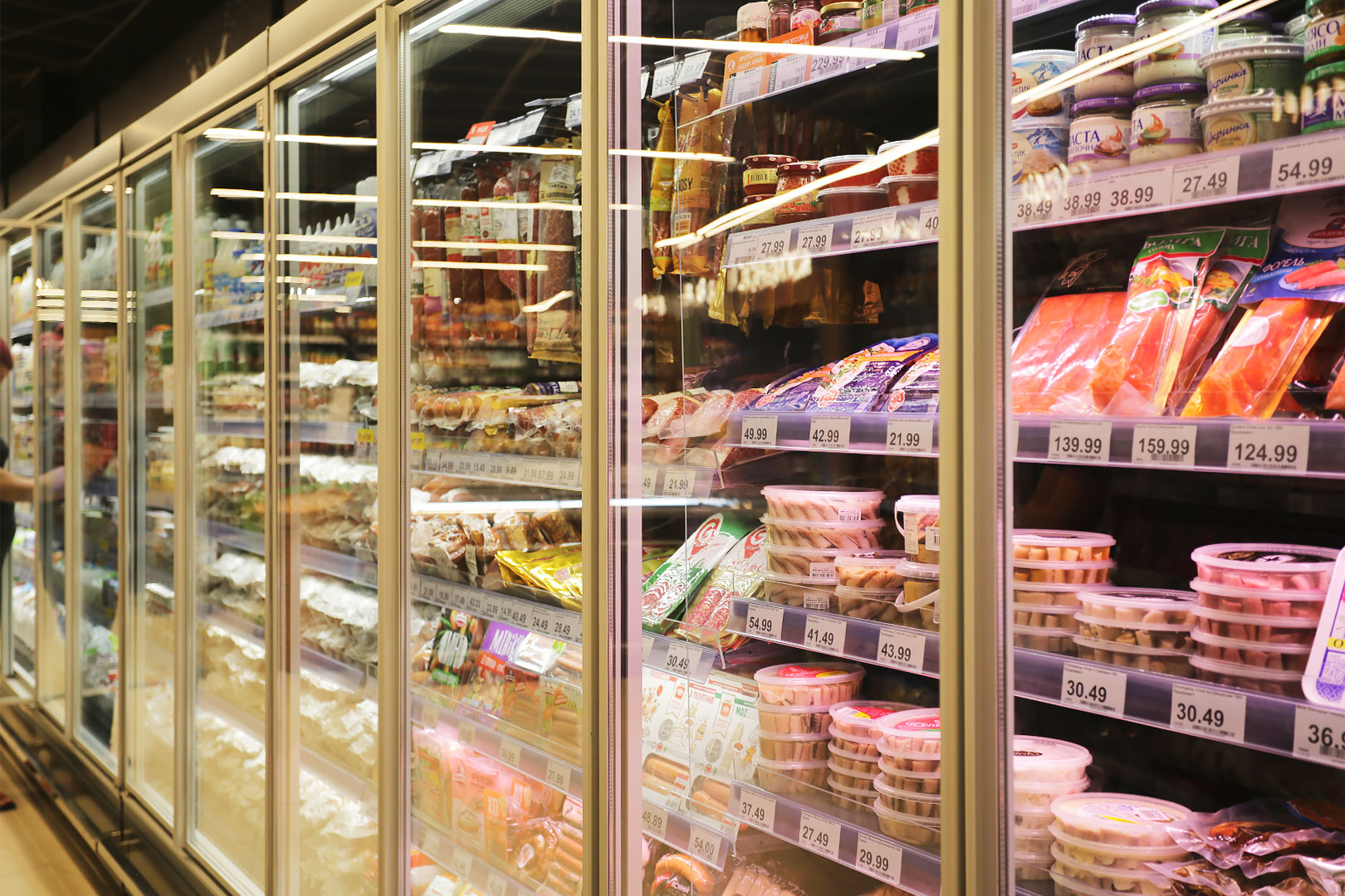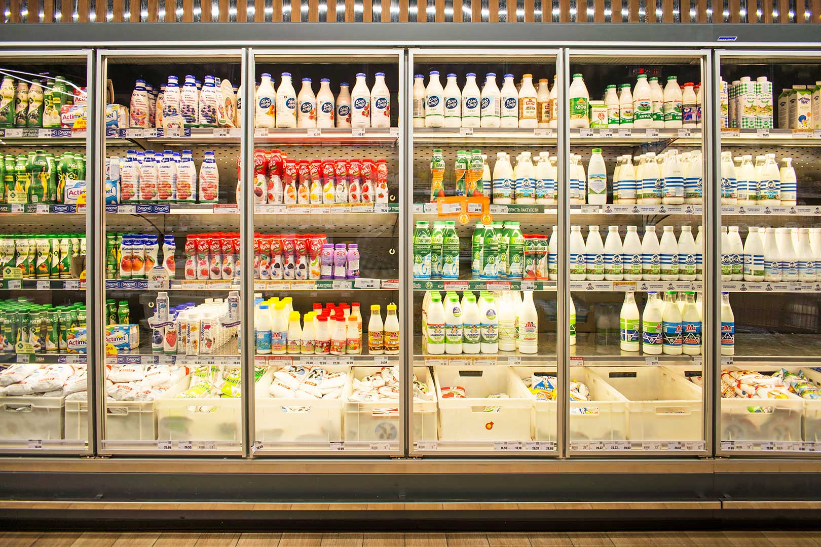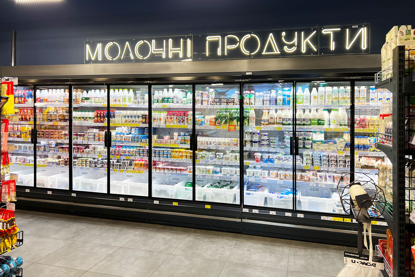 ארון מקרר רב-קומות עם דלתות חסכוניות באנרגיה, המתאים לכל פורמט חנות.