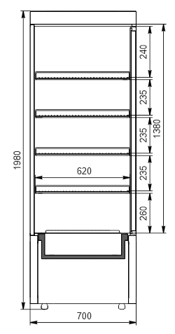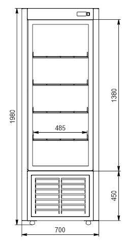 מקרר חלביה Kansas 1 S2 070/210 D А עם ממדים של 700 מ"מ (אורך), 1980 מ"מ (גובה) ו-700 מ"מ (עומק), וקיבולת יעילה של 530 ליטר.