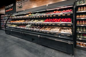 מקרר חצי-אנכי המיועד למכירת ירקות ופירות, עם מערכת קירור פלאג-אין, קירור דינמי ועיצוב מוטה.
