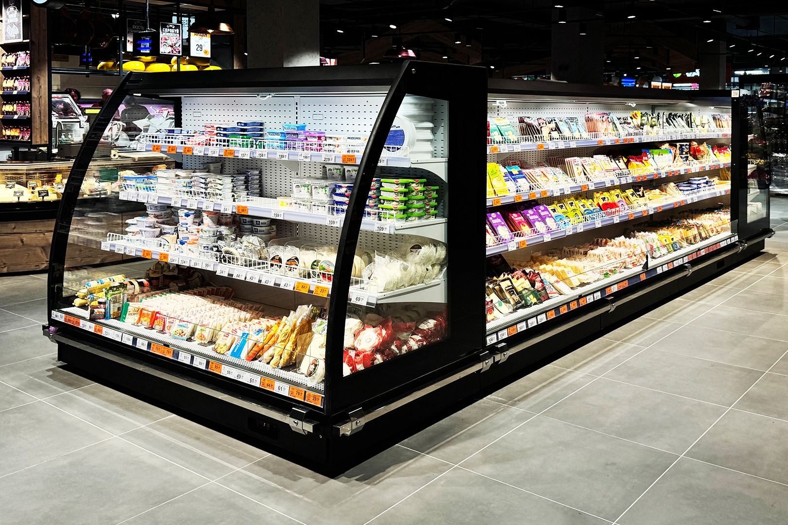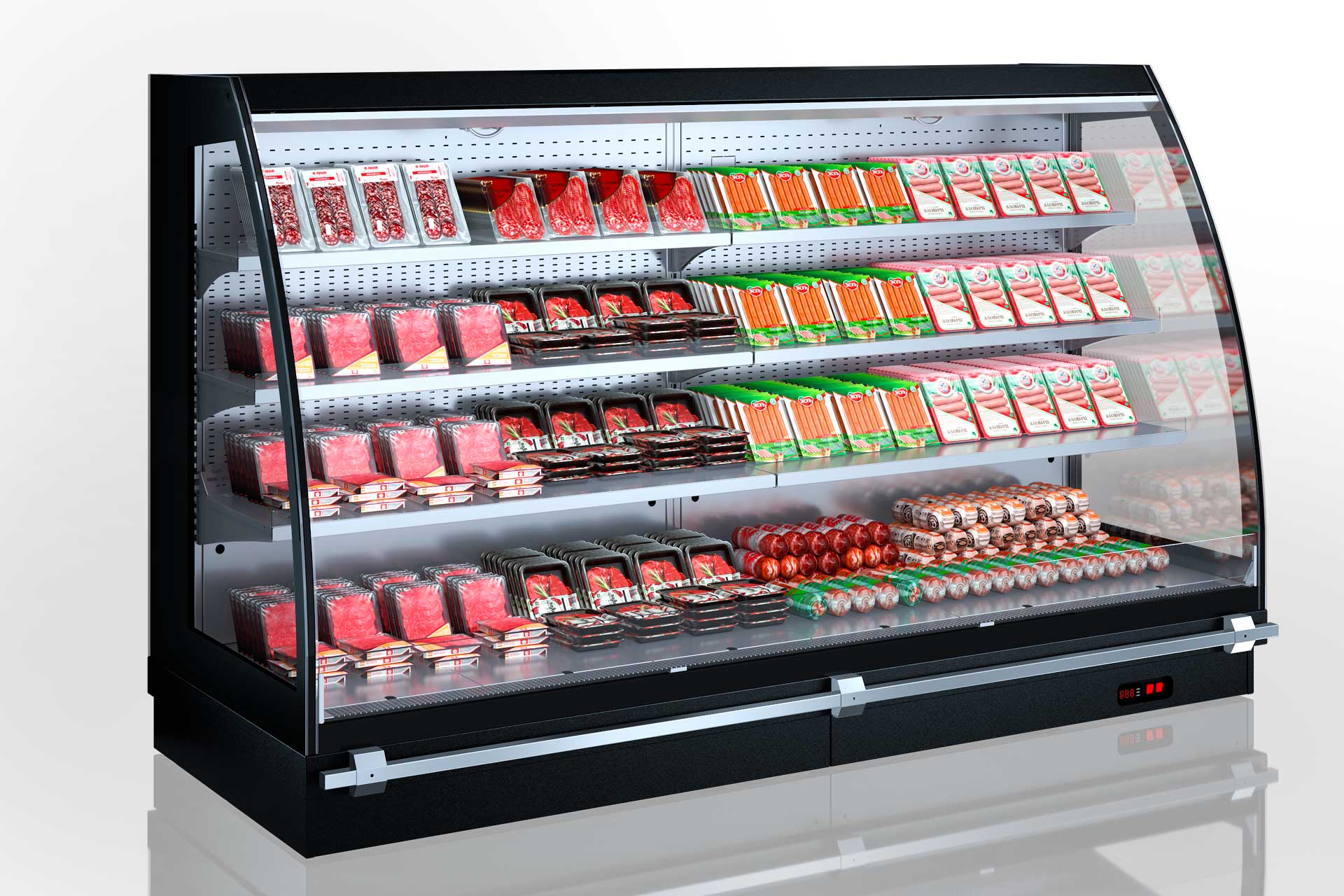 מקרר חצי אנכי המיועד לחנויות בכל פורמט, עם מודולים למבנה אי, תאורה פנימית LED, מאווררים חסכוניים ומערכת מדפים בעומקים משתנים.