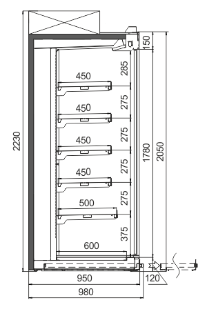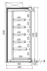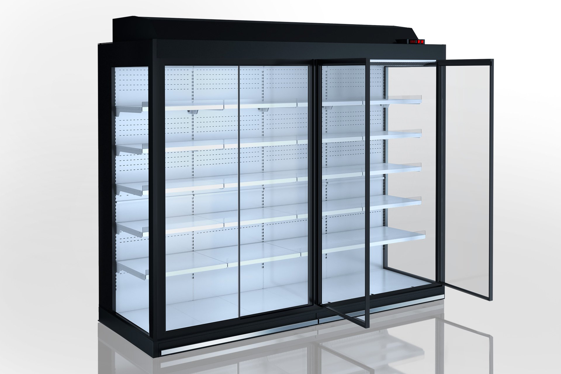ארון רב-קומתי עם במה נמוכה במיוחד המיועד לחנויות בכל פורמט, המיוצר באיכות גבוהה עם מערכת קירור דינמית ותכונות נוחות כגון מגירות נשלפות, מערכת מדפים ברמות שונות ודלתות ניתנות להמרה.