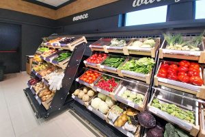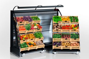 יחידת קירור חיצוניתארון מולטידק למכירת פירות וירקות עם קירור מרוחק, קירור דינמי, תאורת LED פנימית ומראה מוטה.