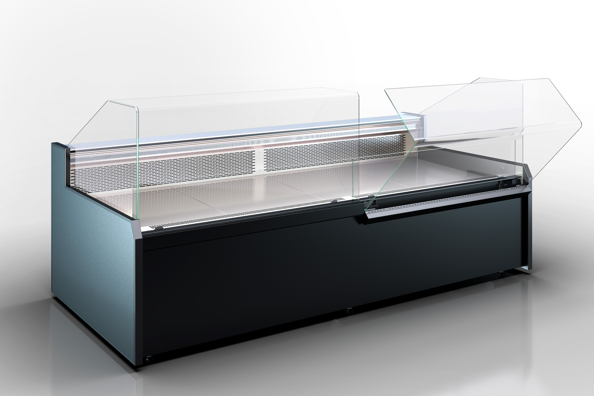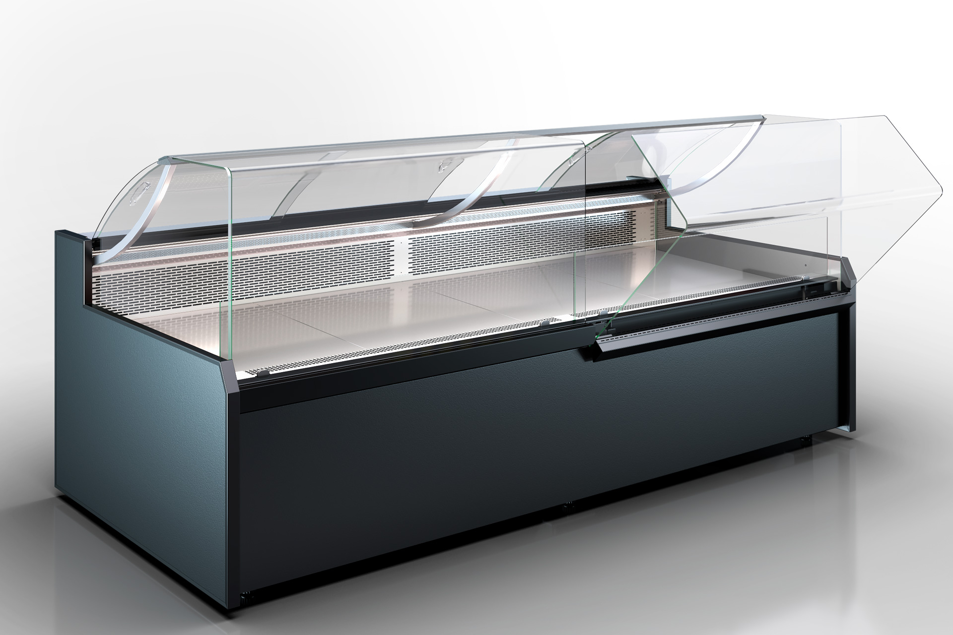 ויטרינת מעדניה עם זכוכית פנורמית הכוללת אפשרות פתיחת דלתות קדמיות, מתאימה לרכיב פלג-אין עם קירור דינמי וחיסכון אנרגטי.