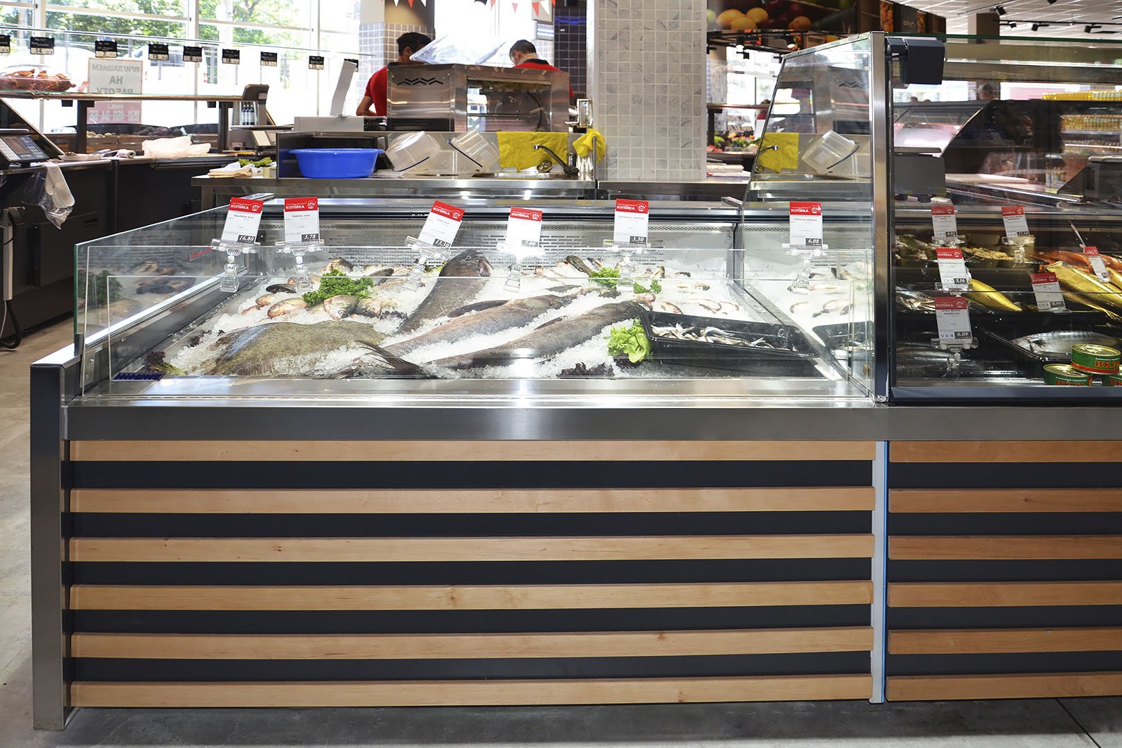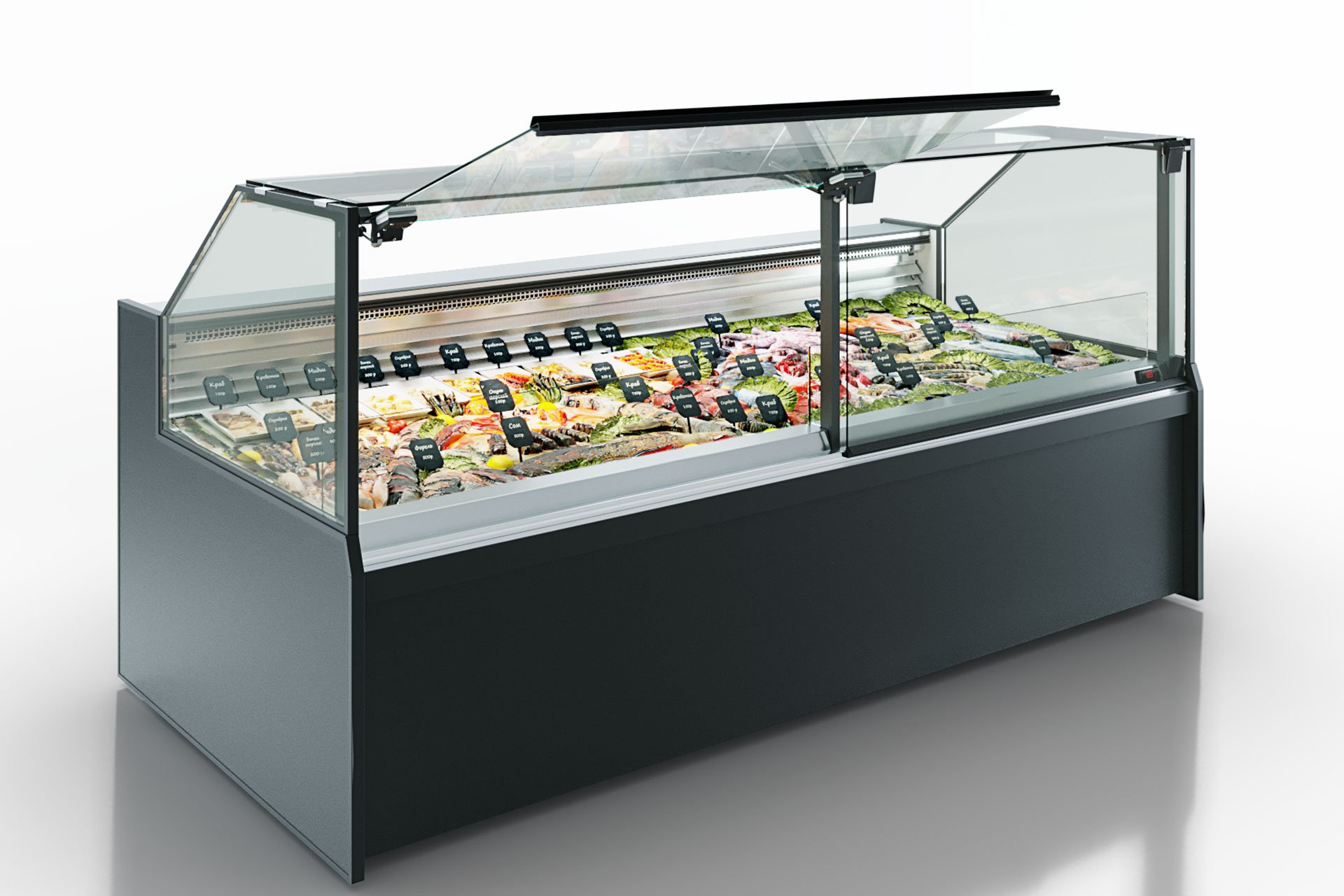 מעמד ספציפי למכירת דגים על קרח במתכון עצמי. זמין במודל self-service. מתאים לשקע חשמלי. עומק תצוגה 880 מ"מ. קירור סטטי. הרמה ואחיזה של זכוכית קדמית באמצעות מערכת גזית. תא פנימי מואר ב-LED. מחלוקת פנים מברזל אל חלד. אפשרויות: עם/ללא תא קירור נוסף.