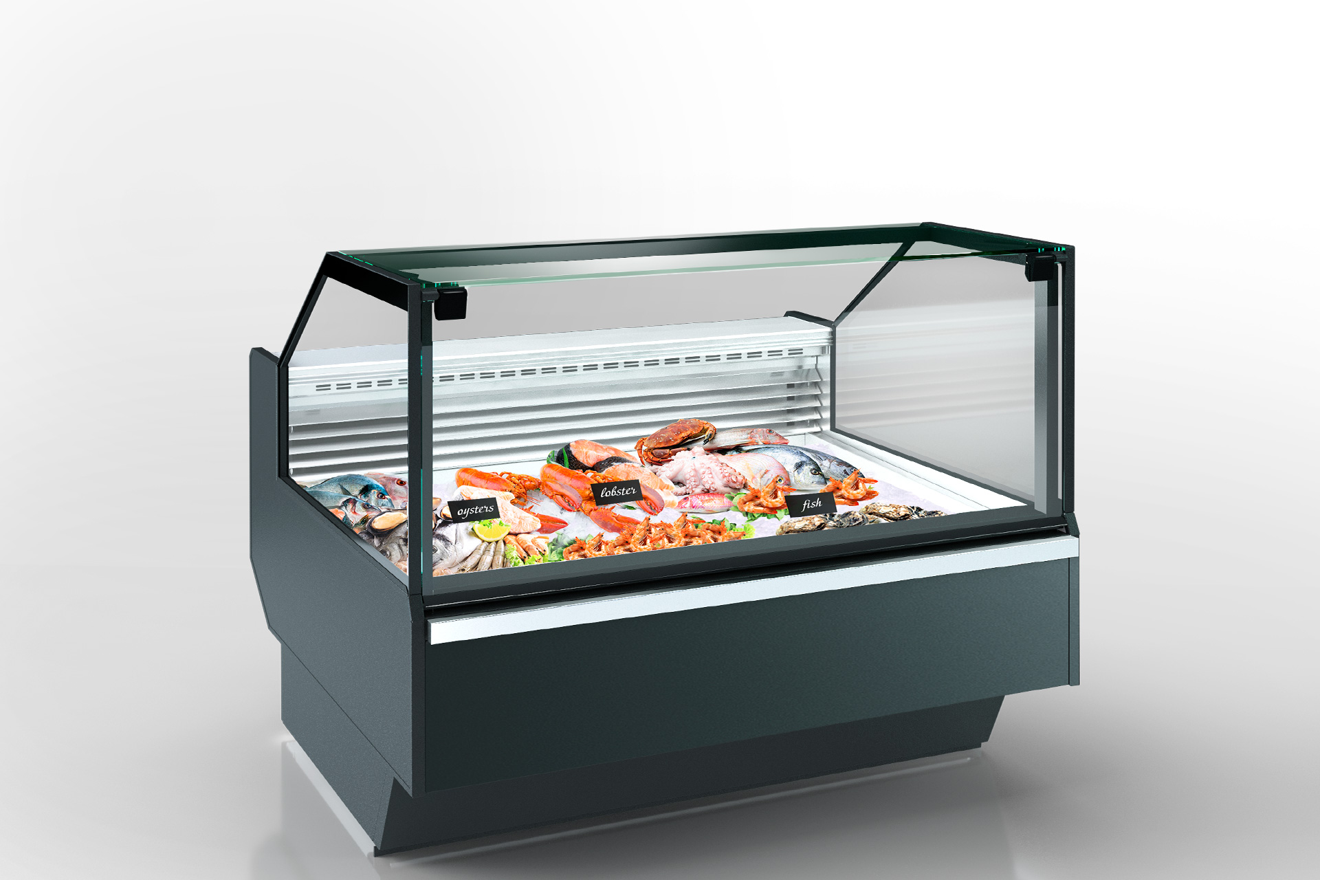 קונטר חשמלי ייחודי למכירת דגים טריים על קרח, המתחבר למערכת קירור חיצונית או מתאים לחיבור פלאג-אין, עם תצוגת סחורה מעוצבת.