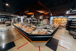 מכשיר מקרר מעדניה עם אלמנטים זוויתיים, המחובר למערכת קירור חיצונית, המציע קירור דינמי וחיסכון באנרגיה.