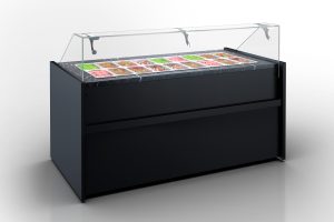 זוהי ויטרינה מומחית למכירת סלטים עם חיבור למערכת קירור מרוחקת או התקנה של plug-in, הכוללת קירור דינמי, משטח עבודה מנירוסטה ותא קירור נוסף.