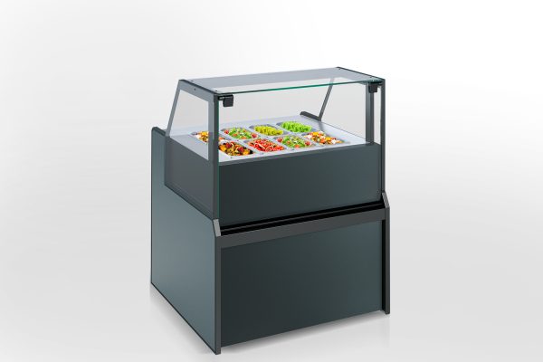 קונטור מיוחד למכירת סלטים, המציע חיבור למערכת קירור חיצונית או התקנה כפלאג-אין, קירור דינמי, הרמת זכוכית חזית עם מערכת גז-ליפט, אזור עבודה מברזל אל חלד ותא קירור נוסף.