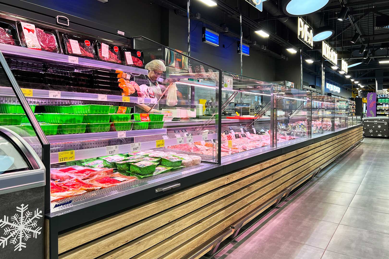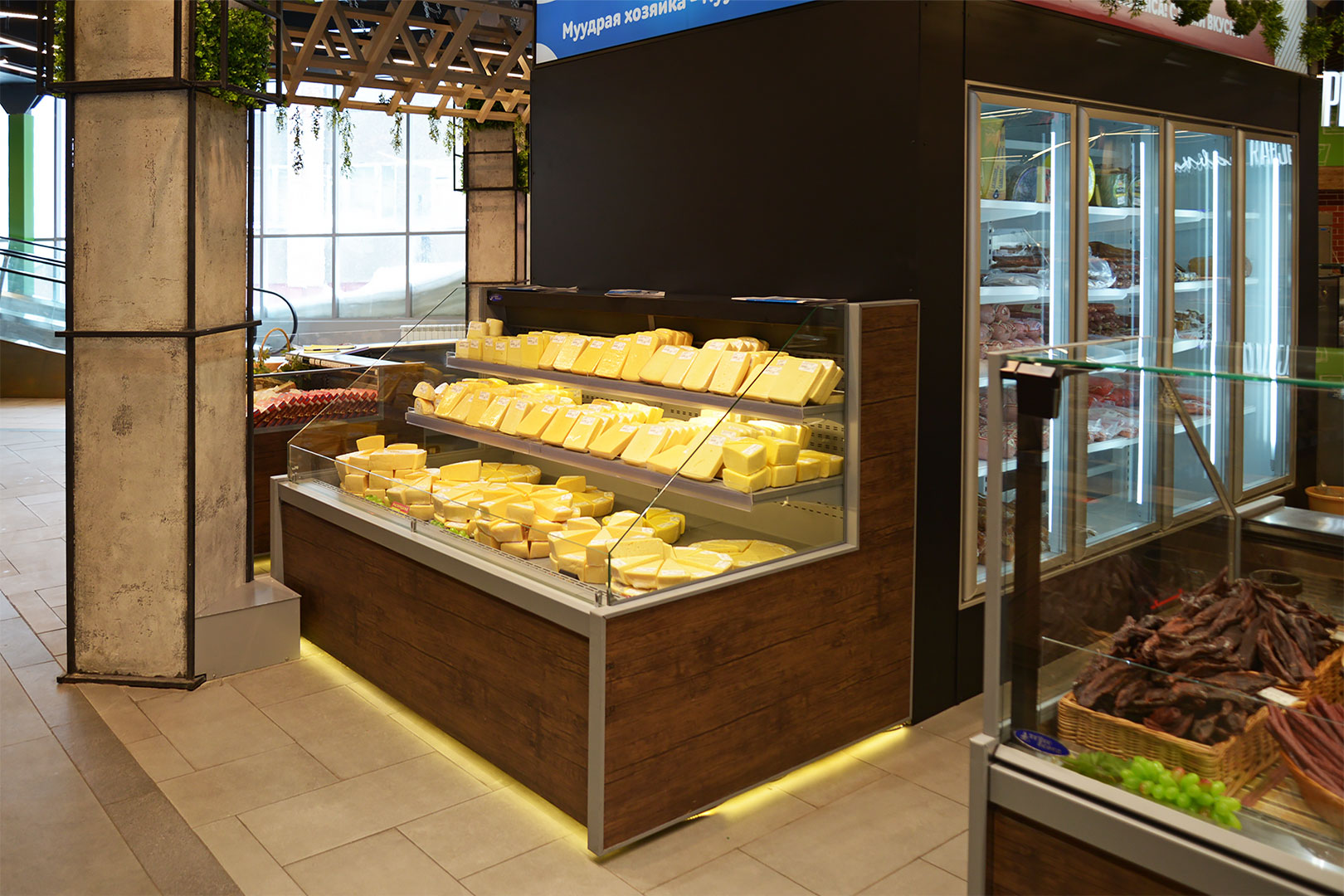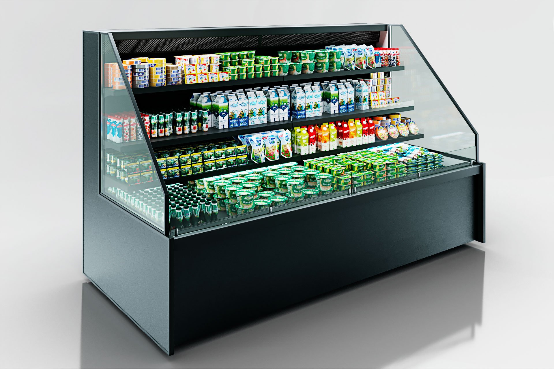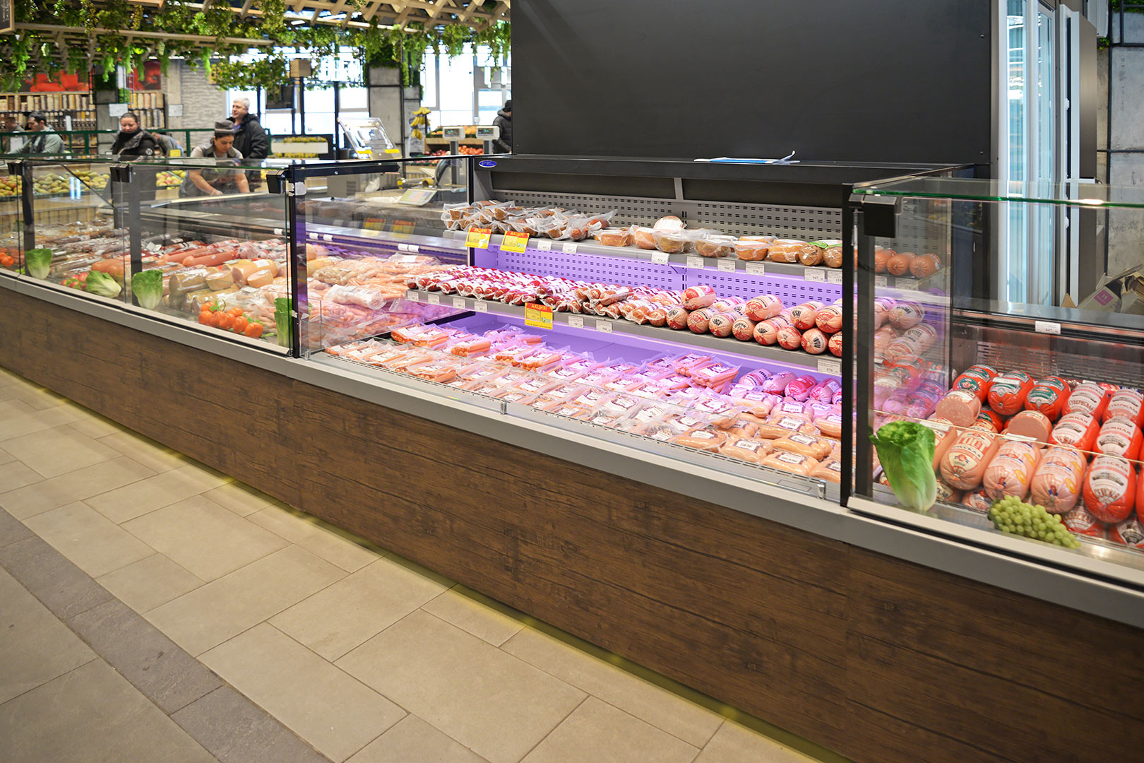 דלפק שירות עצמי עם תצוגת סחורה בסגנון מסולסל, הכולל תאורת LED ואפשרות חיבור למערכת קירור מרחוק.