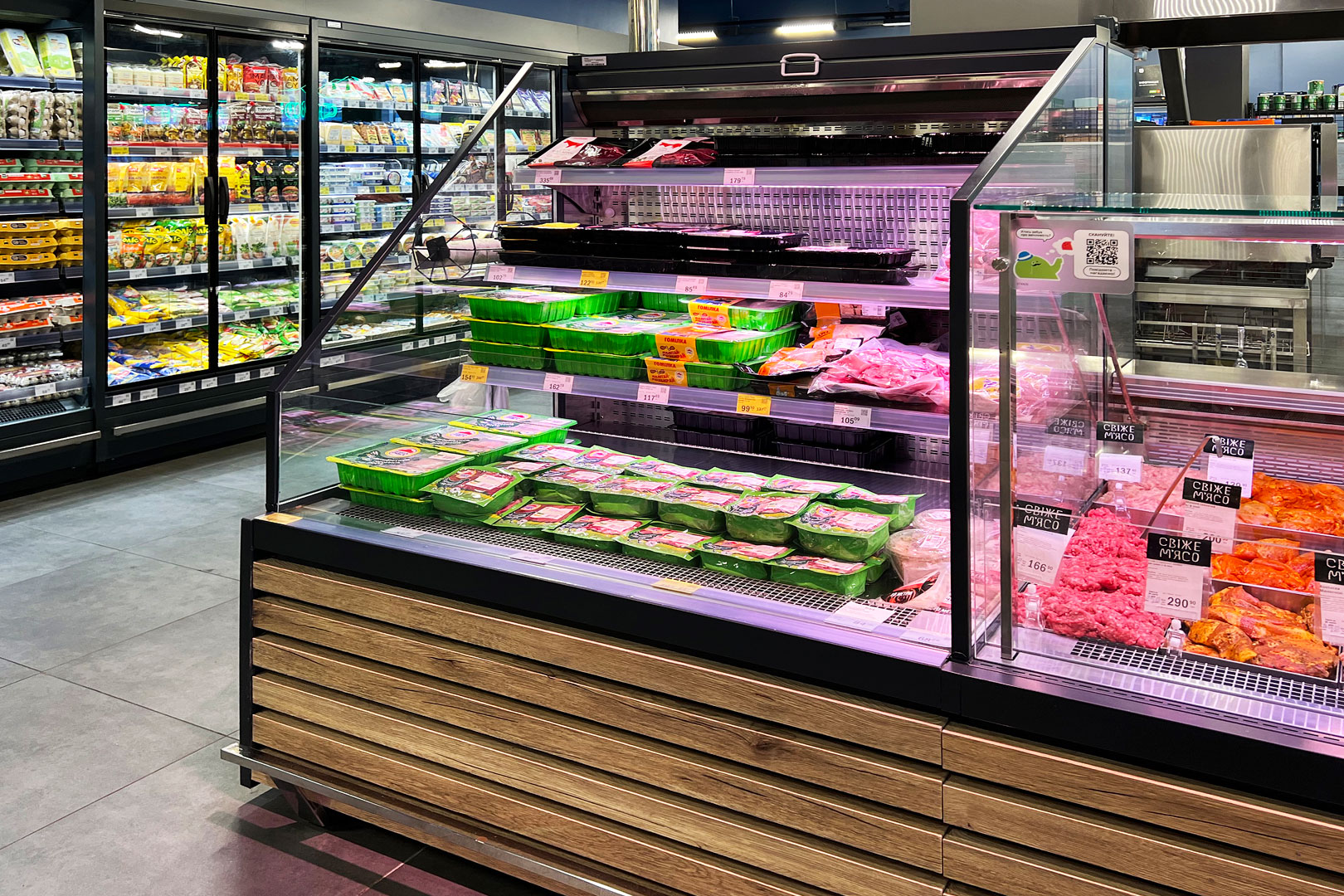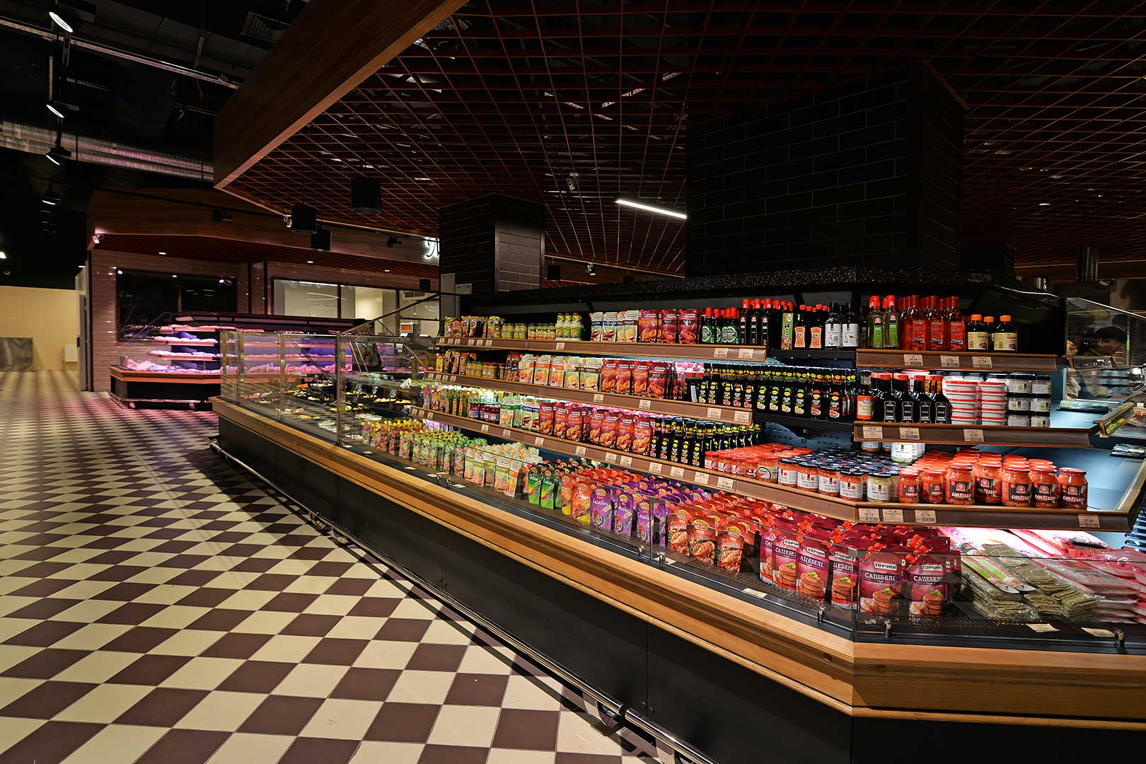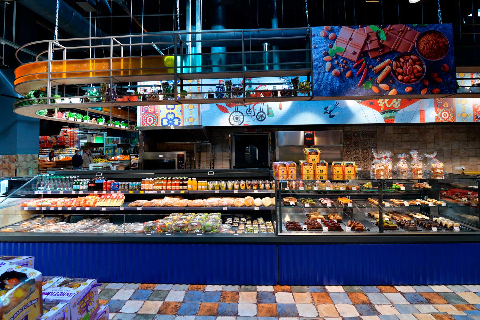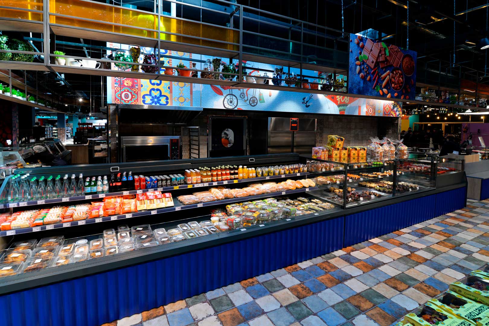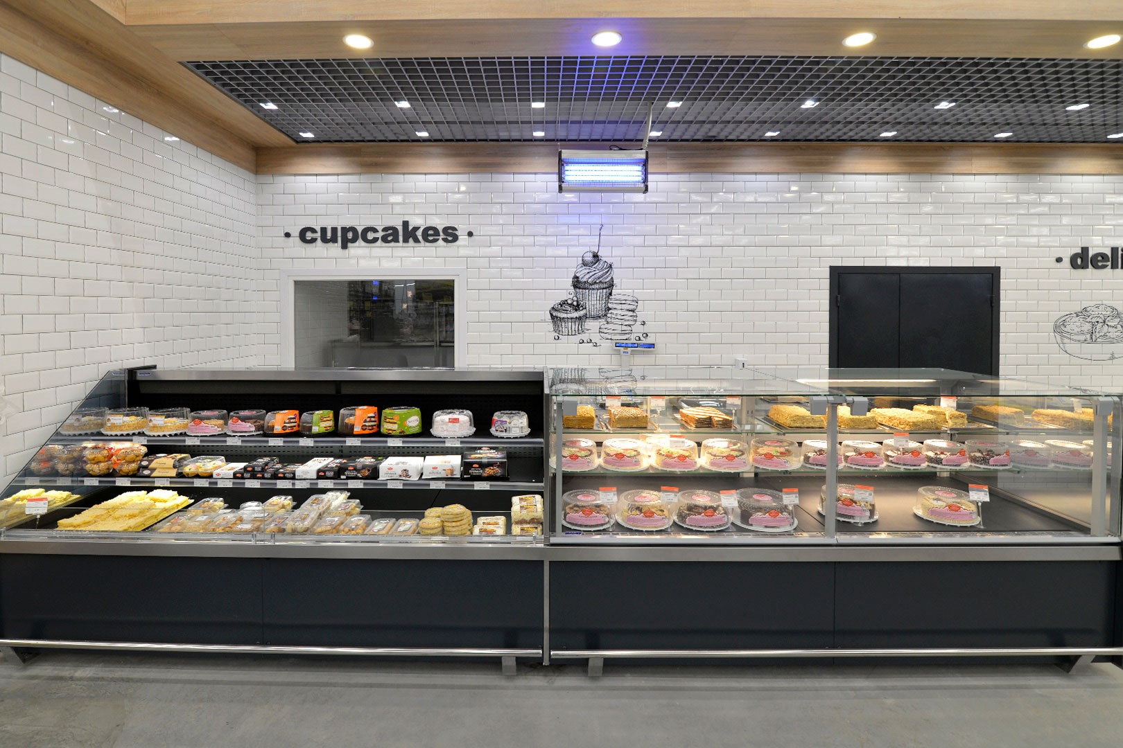 דלפק שירות עצמי עם תצוגת סחורה בסגנון מסולסל, הכולל תאורת LED ואפשרות חיבור למערכת קירור מרחוק.