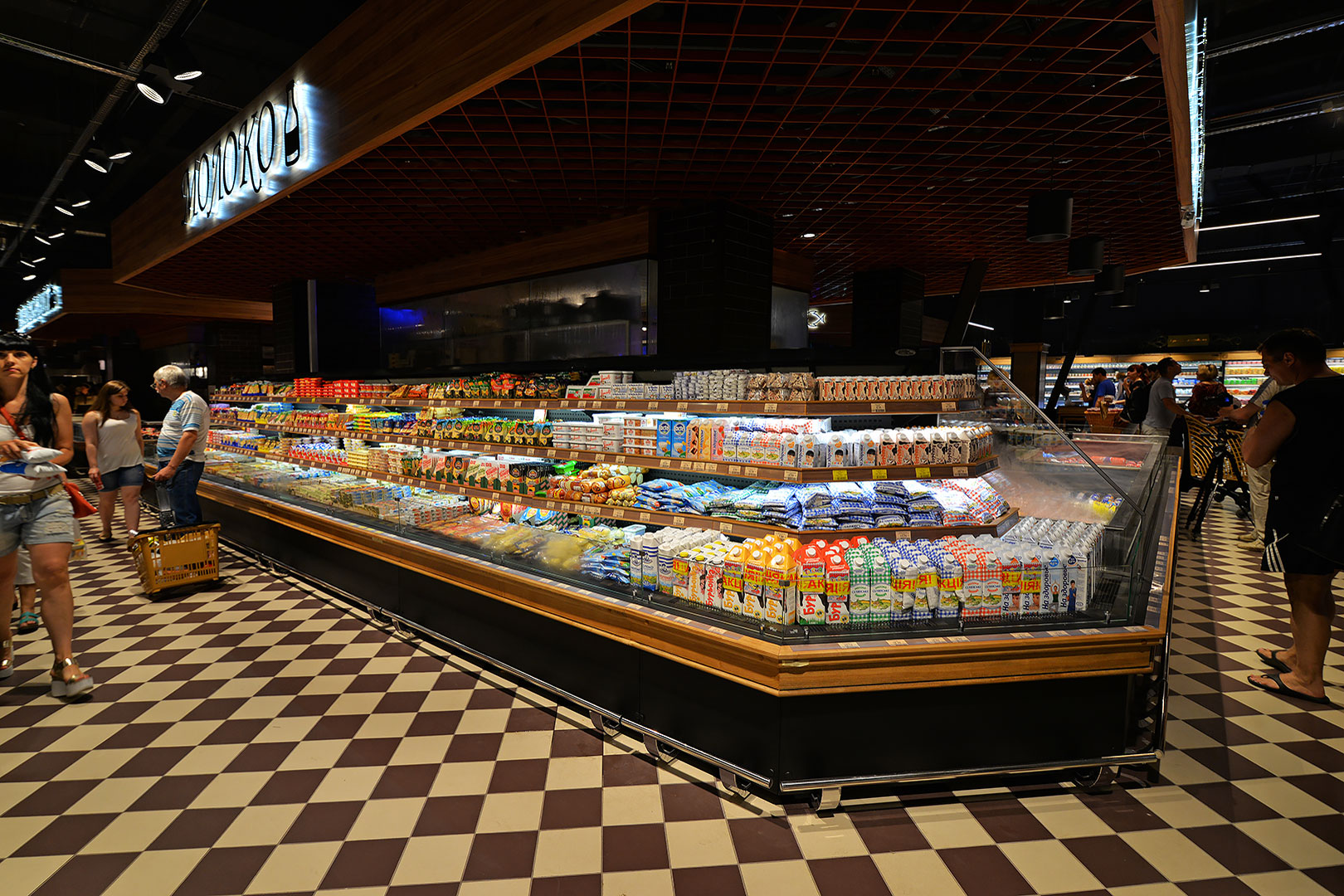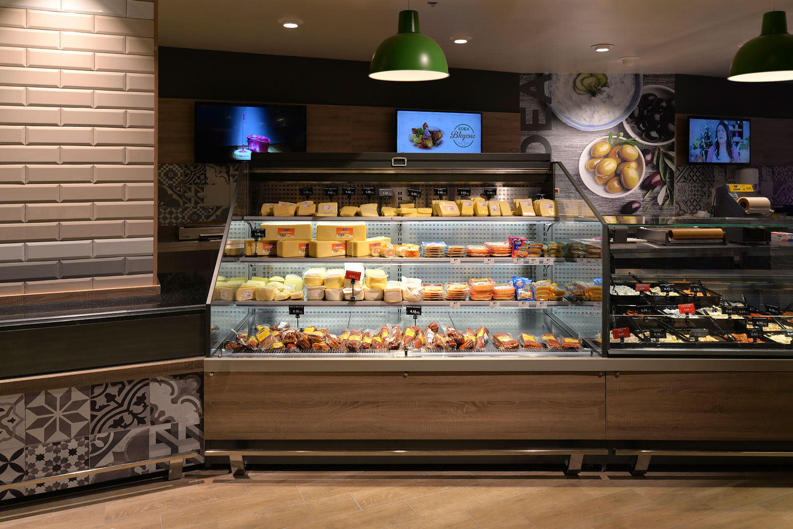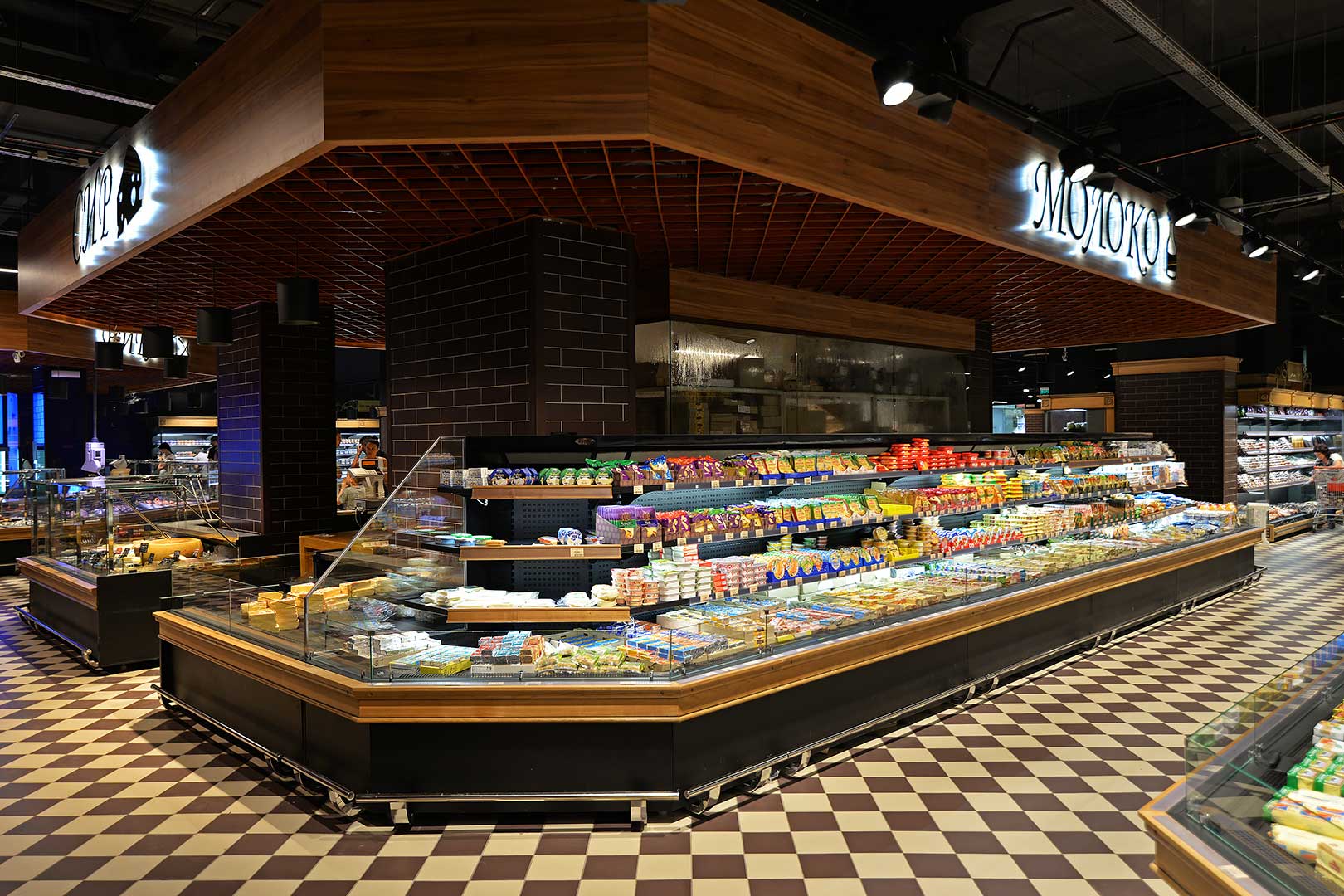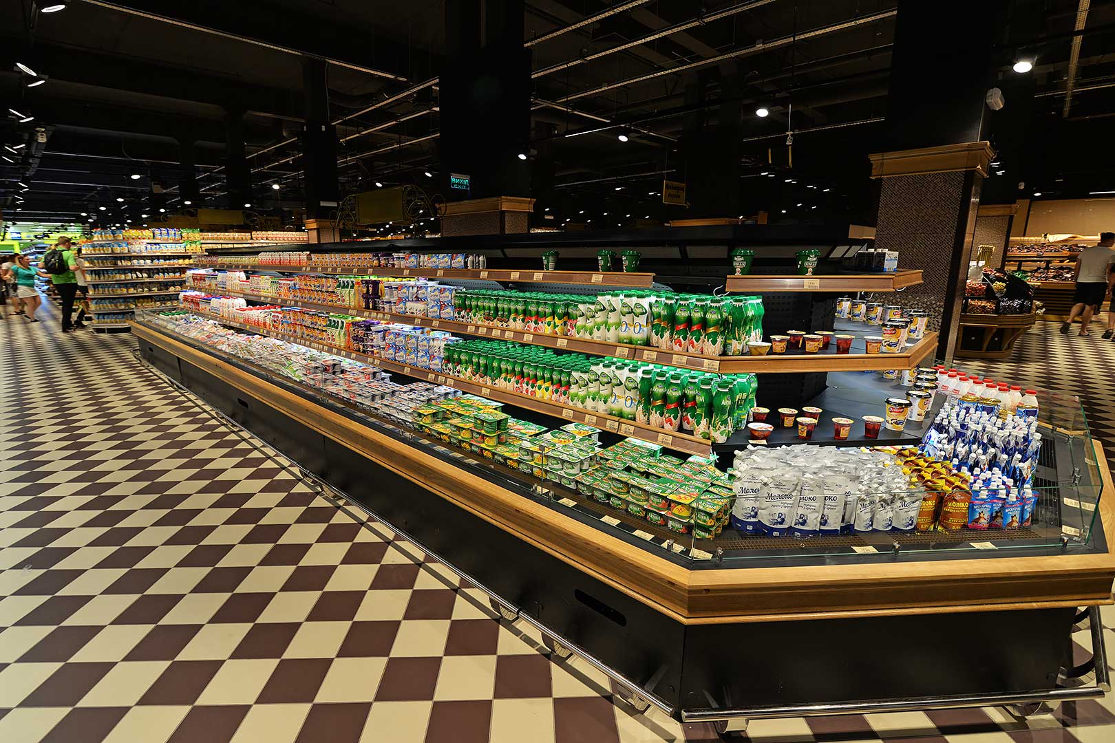 דלפק שירות עצמי עם תצוגת סחורה בסגנון מסולסל, הכולל תאורת LED ואפשרות חיבור למערכת קירור מרחוק.