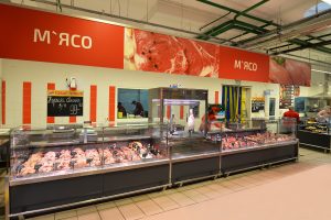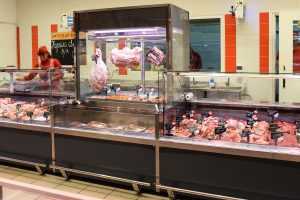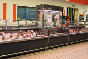 מונה עבור מכירת בשר טרי על ווים עם חלק תצוגה נוסף.