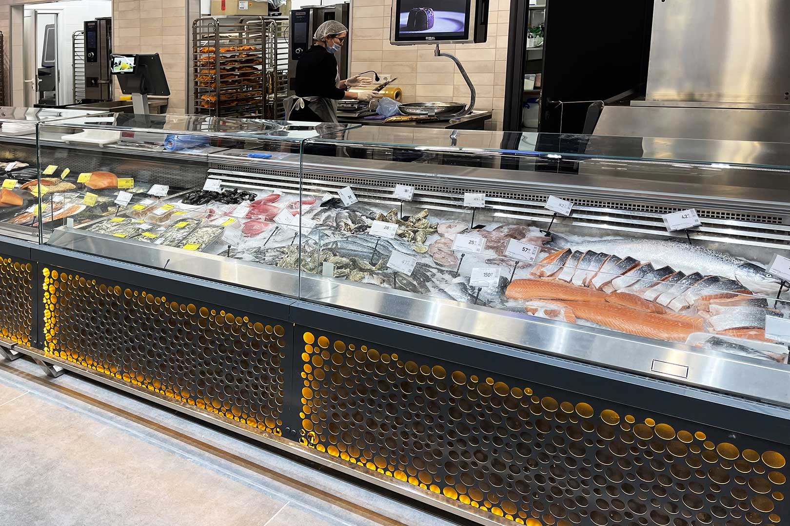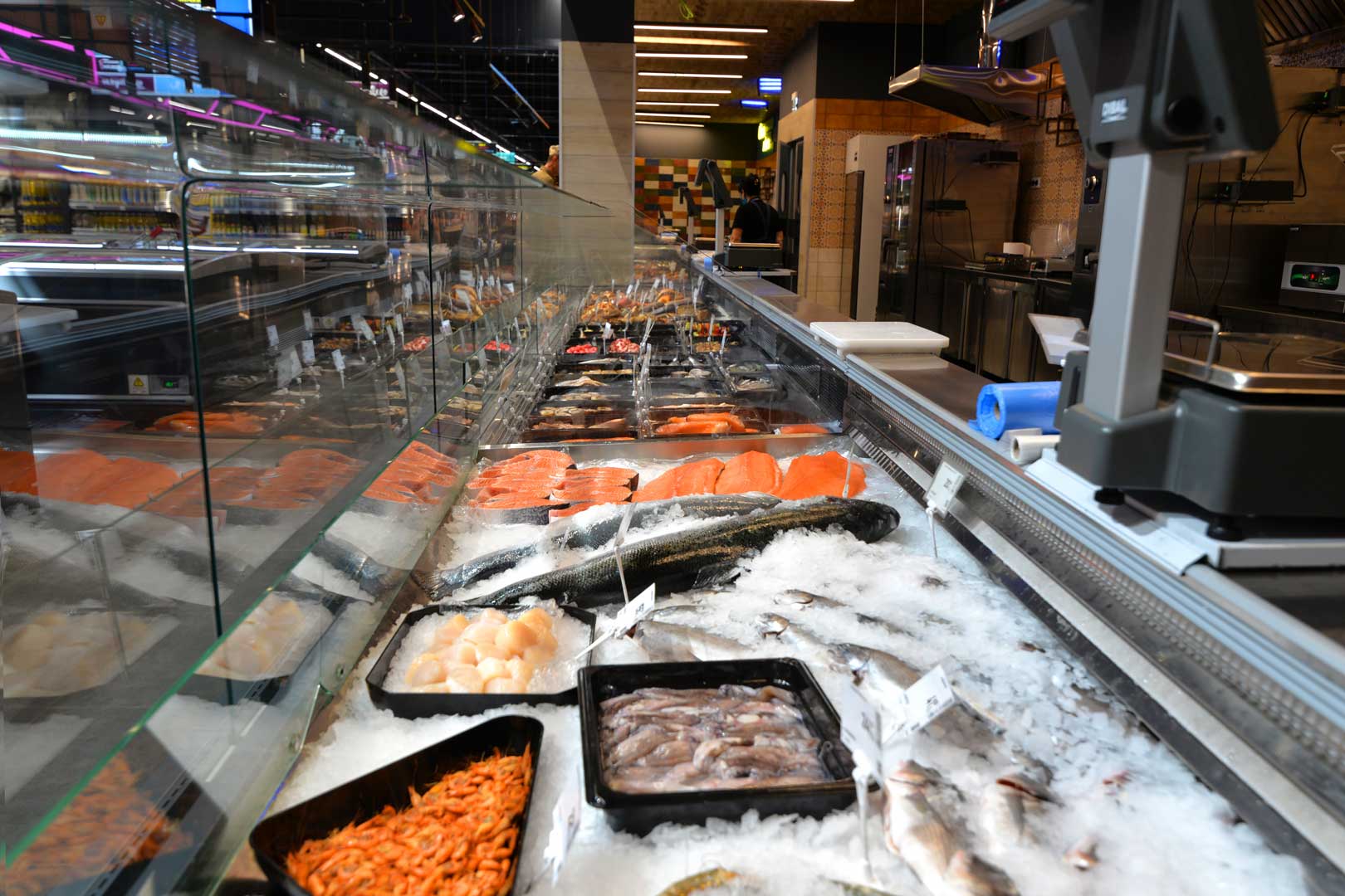 מקרר ספציאליזי לקירור דגים טריים על קרח, זמין גם בגרסת שירות עצמי.