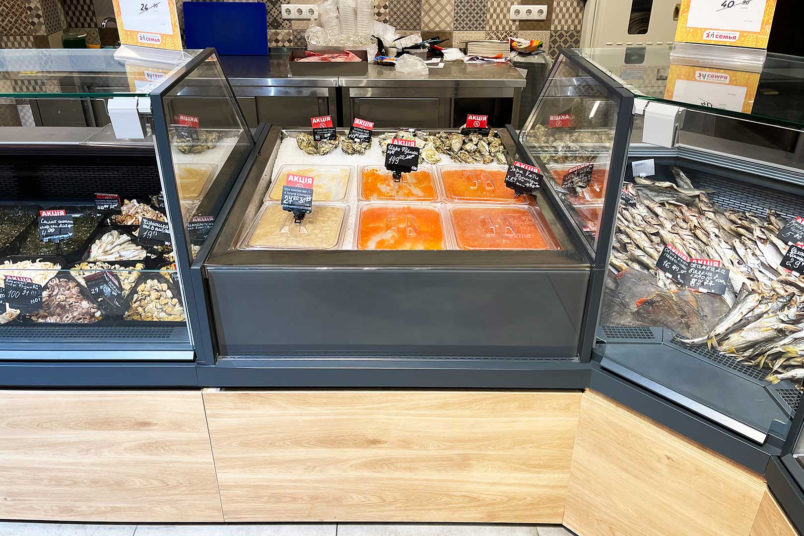 מודול מקורר למכירת דגים טריים או בשר על קרח עם אמבט פנימי מנירוסטה.