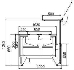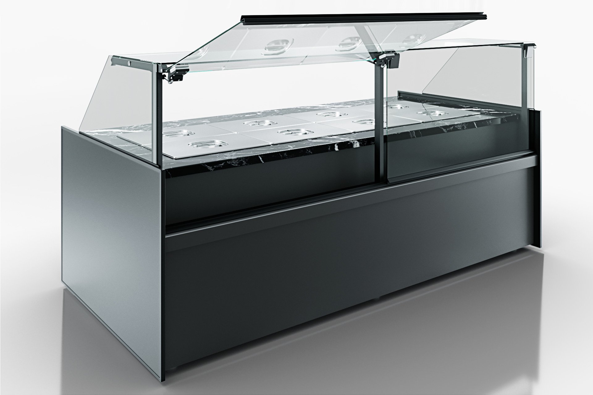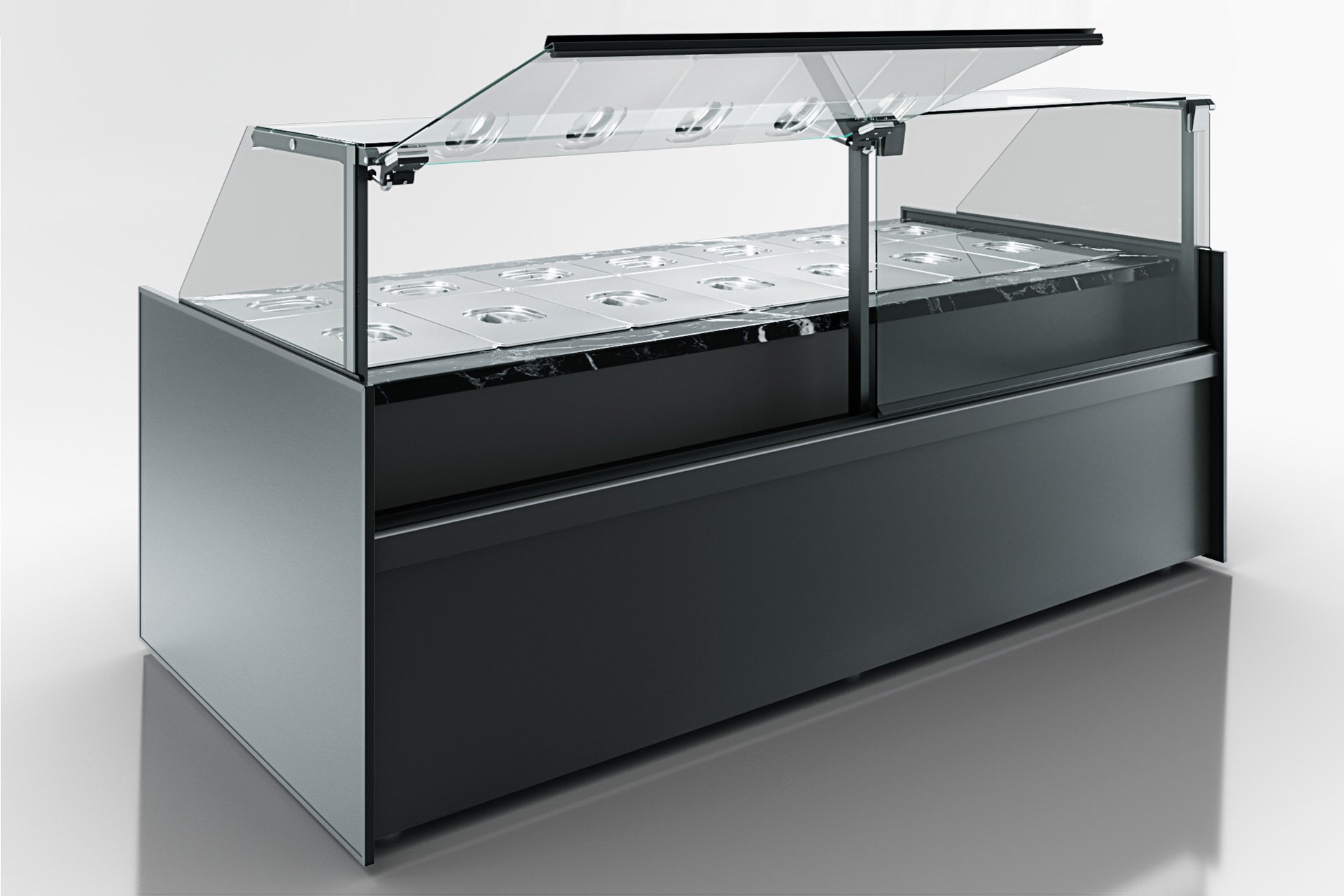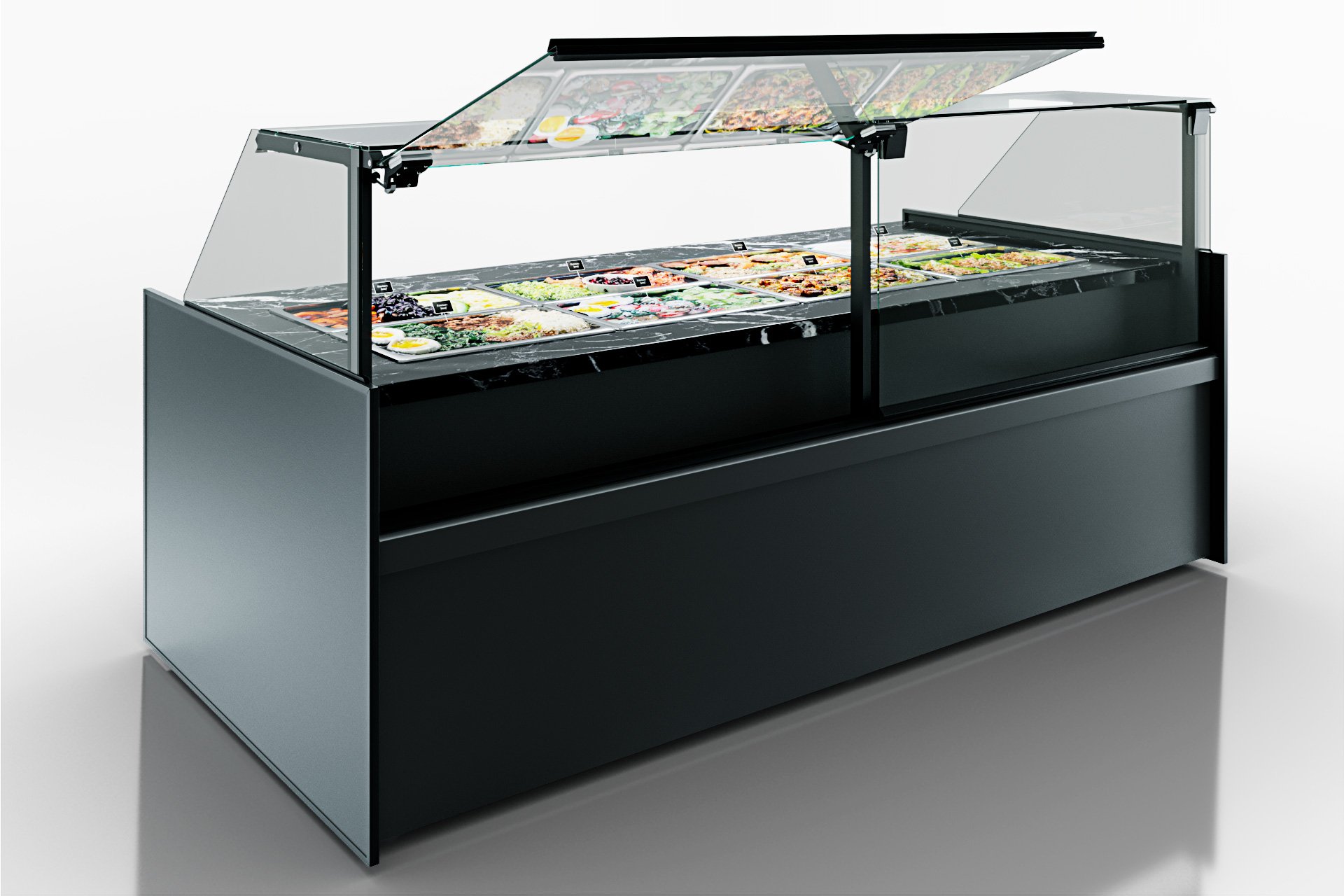סופר קירור חם למנות חמות עם שמירה על טמפרטורה באמצעות אוויר חם, אזור עבודה ונחלת נירוסטה, הרמת ושימור הזכוכית הקדמית באמצעות מערכת גזית, ותאורה פנימית LED.