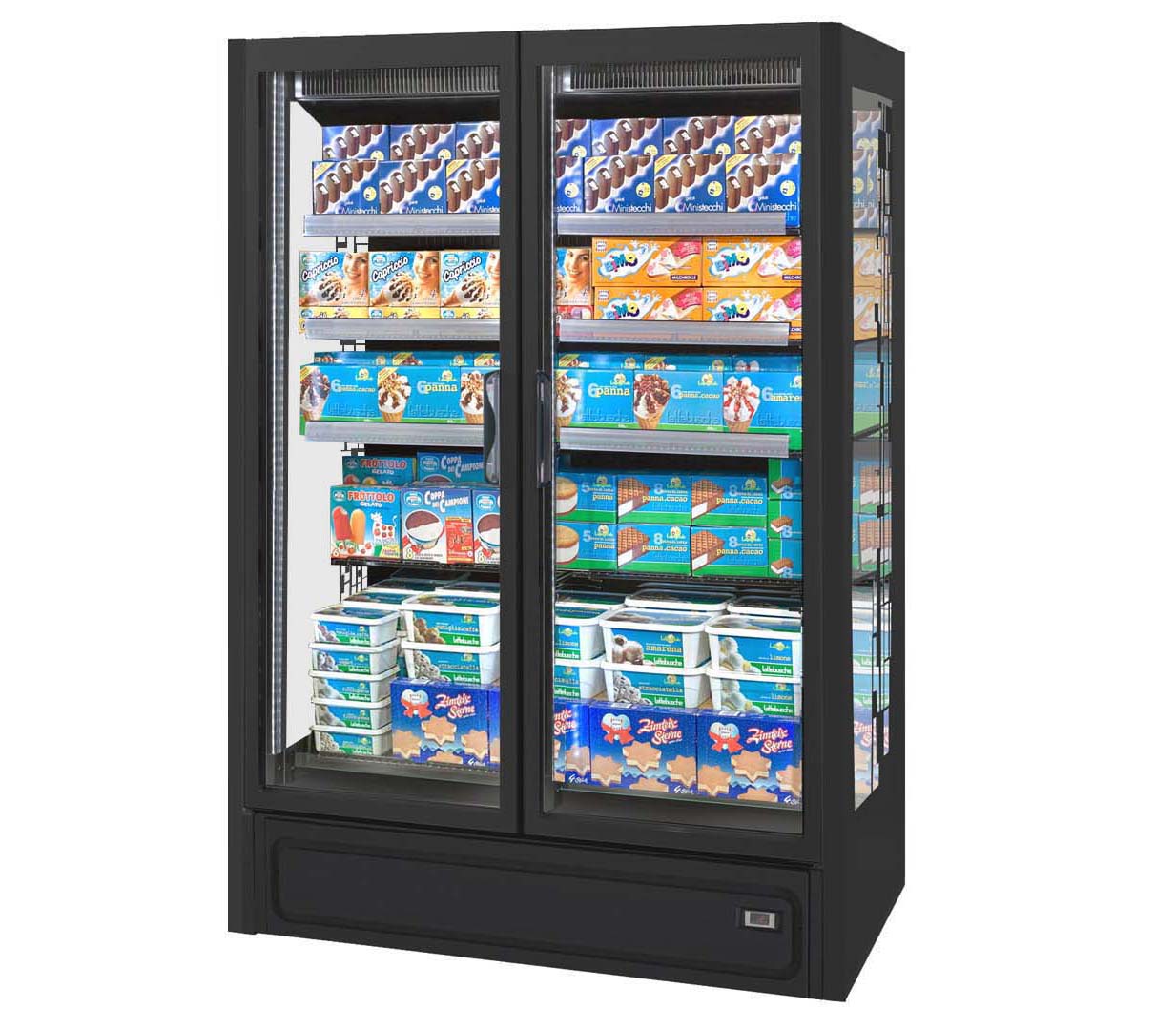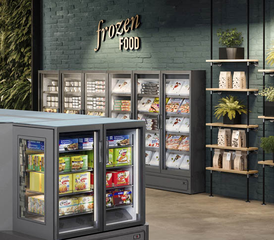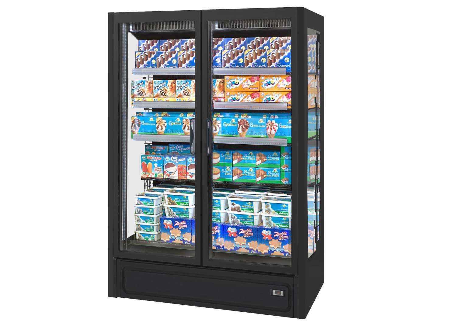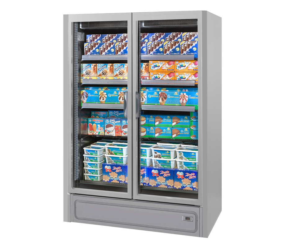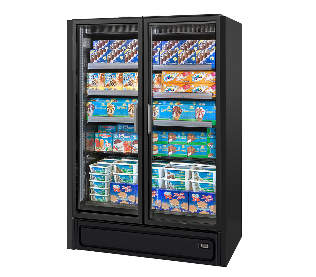 ארון קירור אנכי עם דלתות, הפועל באמצעות גז קירור פרופאן (R290), ומציג את המוצרים הקפואים בצורה מעולה. מתאים לכל שטחי המכירה ממינימרקטים ועד לסופרמרקטים גדולים.