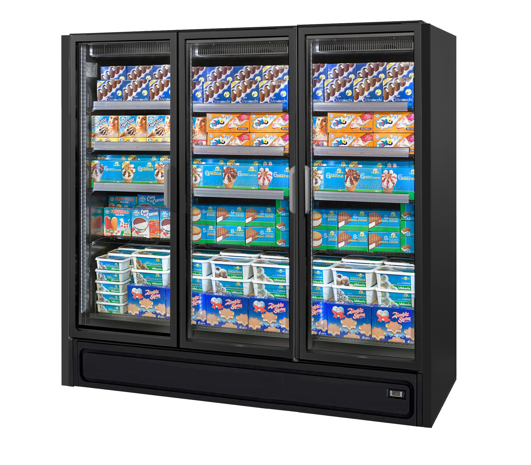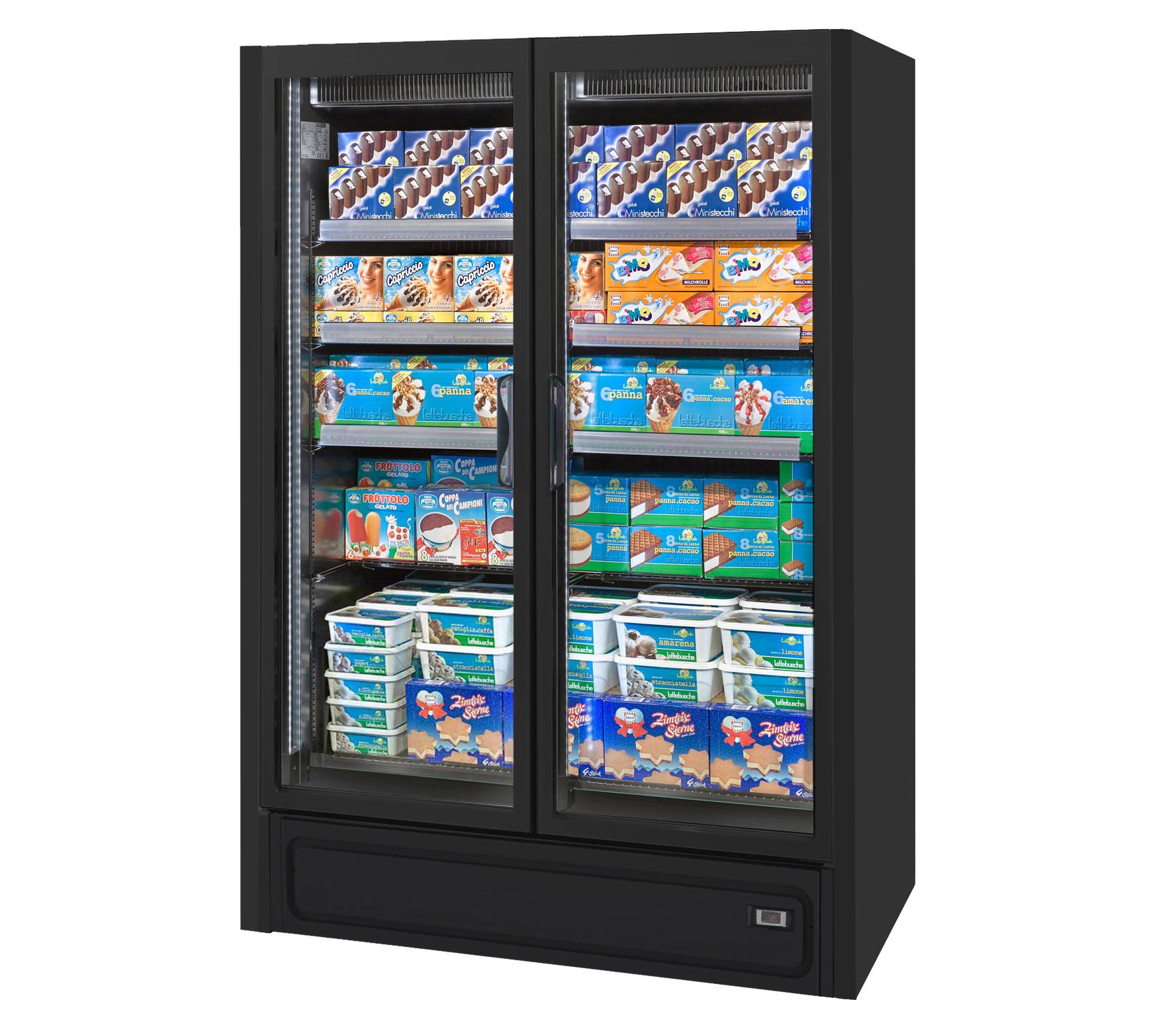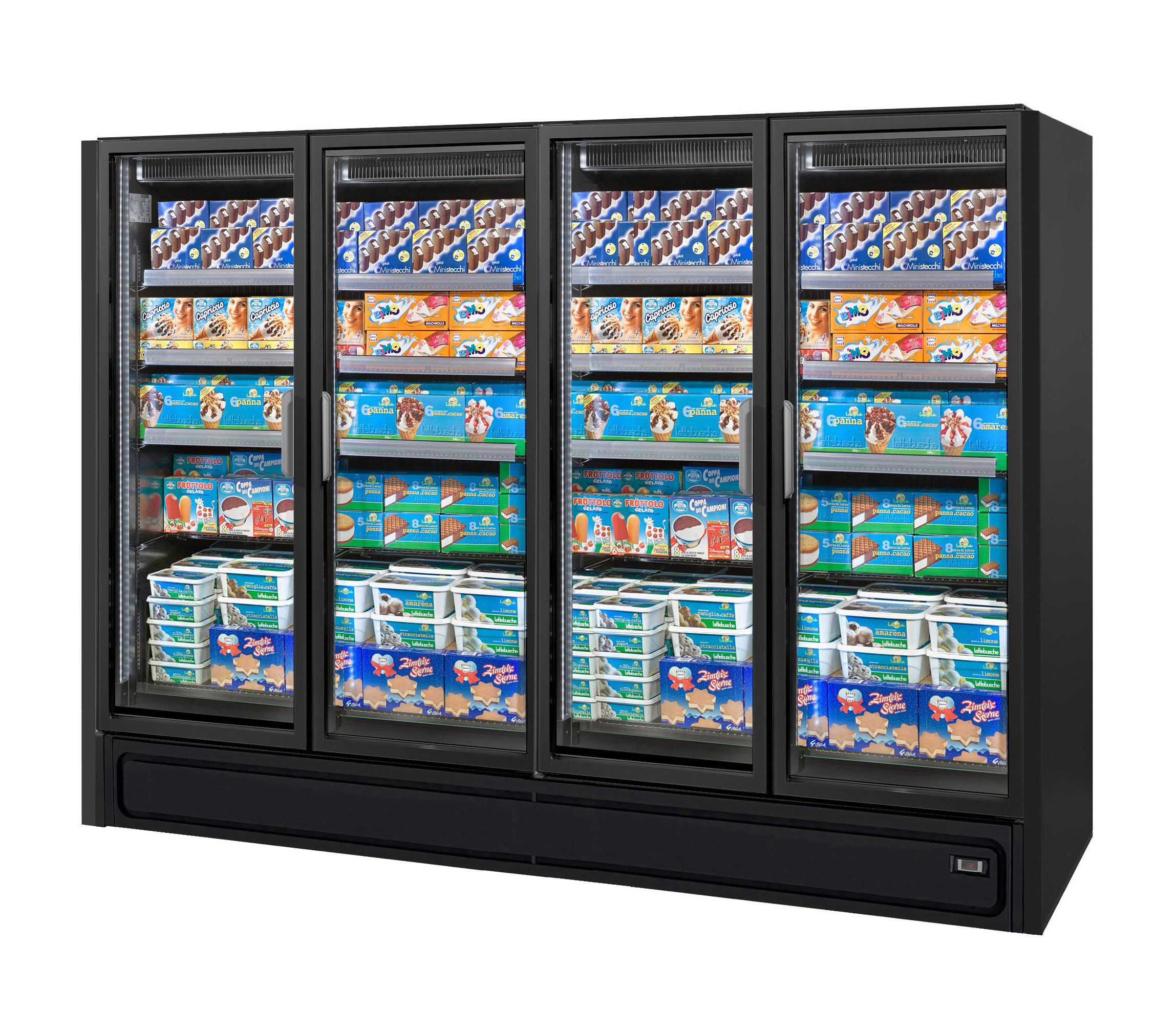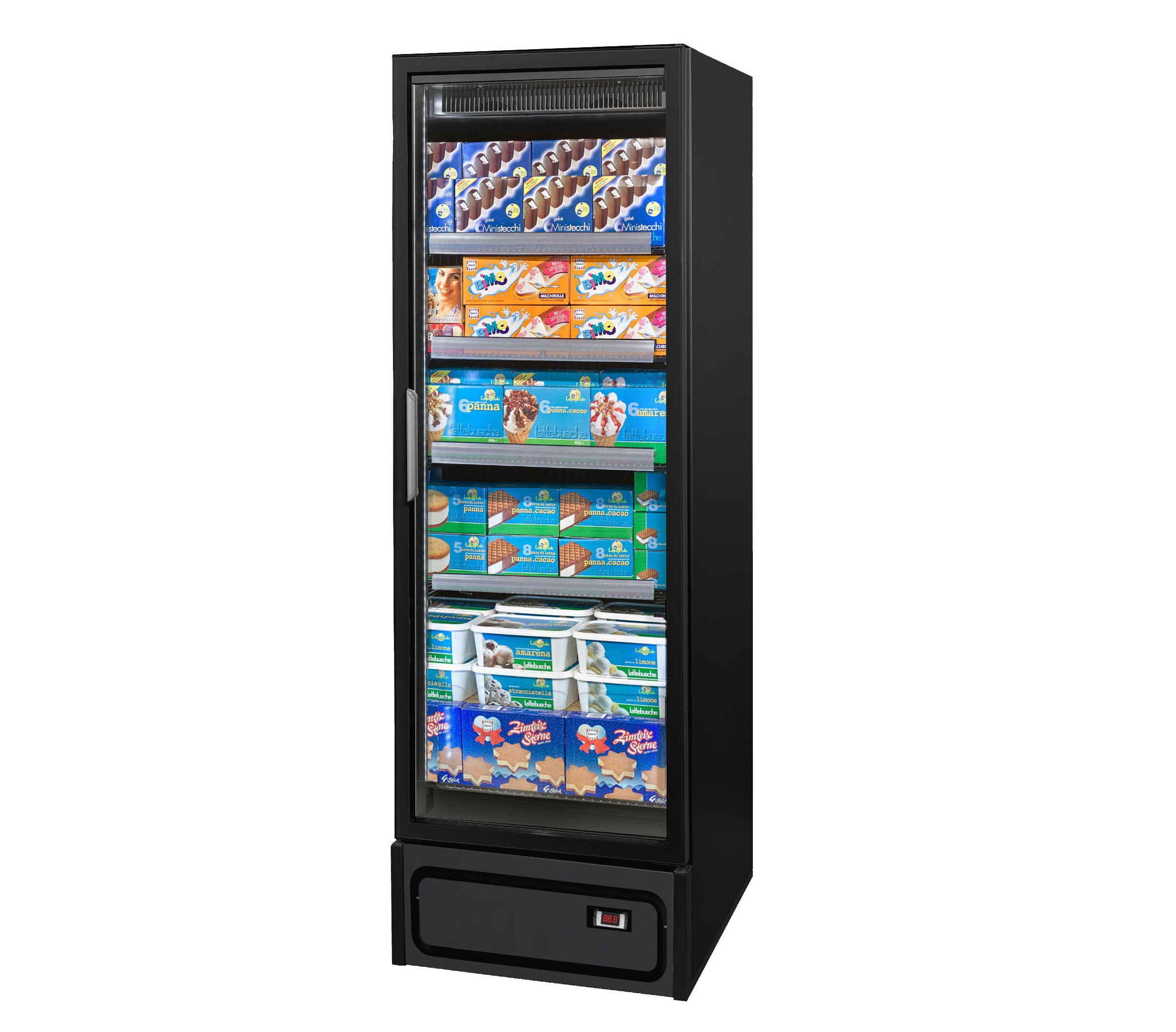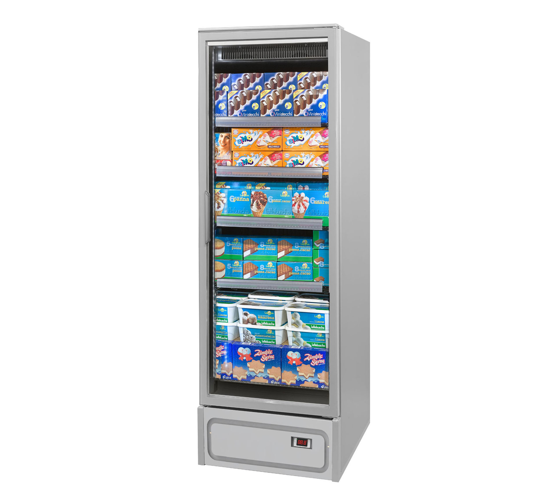 ארון קירור אנכי עם דלתות, הפועל באמצעות גז קירור פרופאן (R290), ומציג את המוצרים הקפואים בצורה מעולה. מתאים לכל שטחי המכירה ממינימרקטים ועד לסופרמרקטים גדולים.