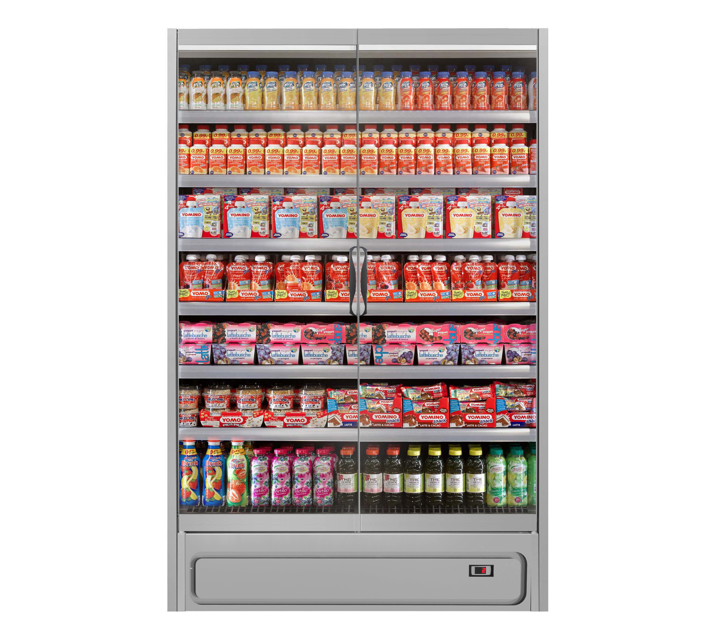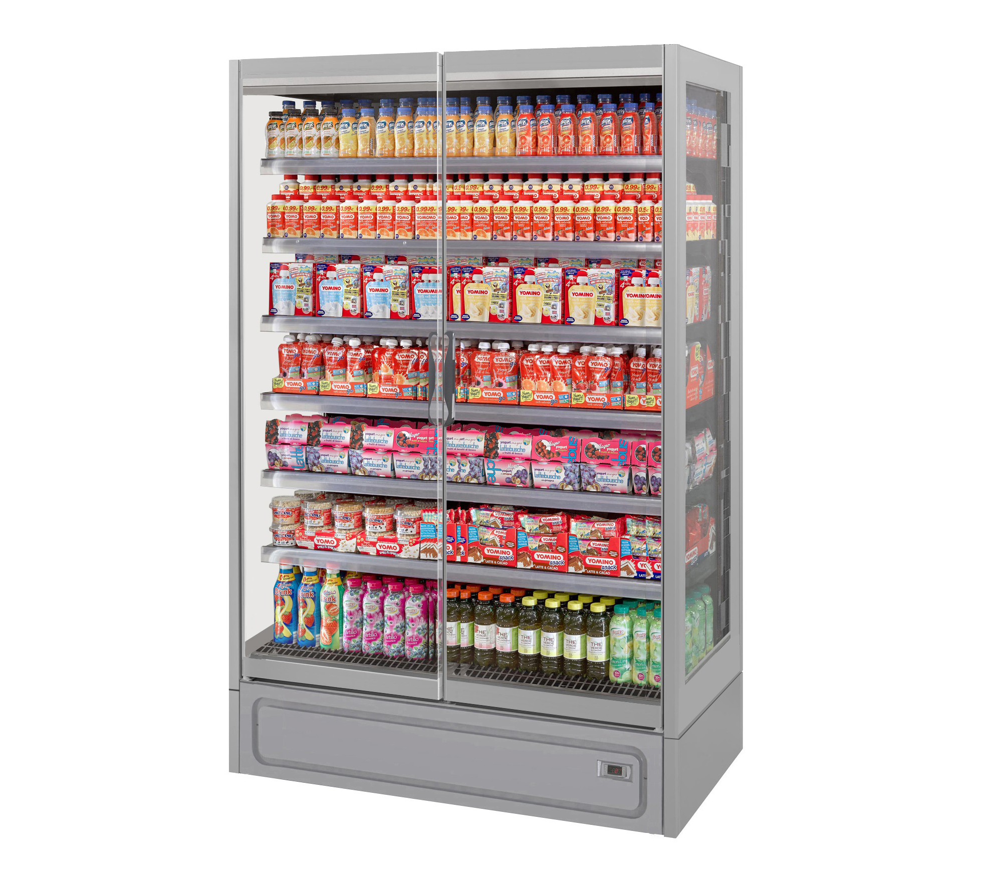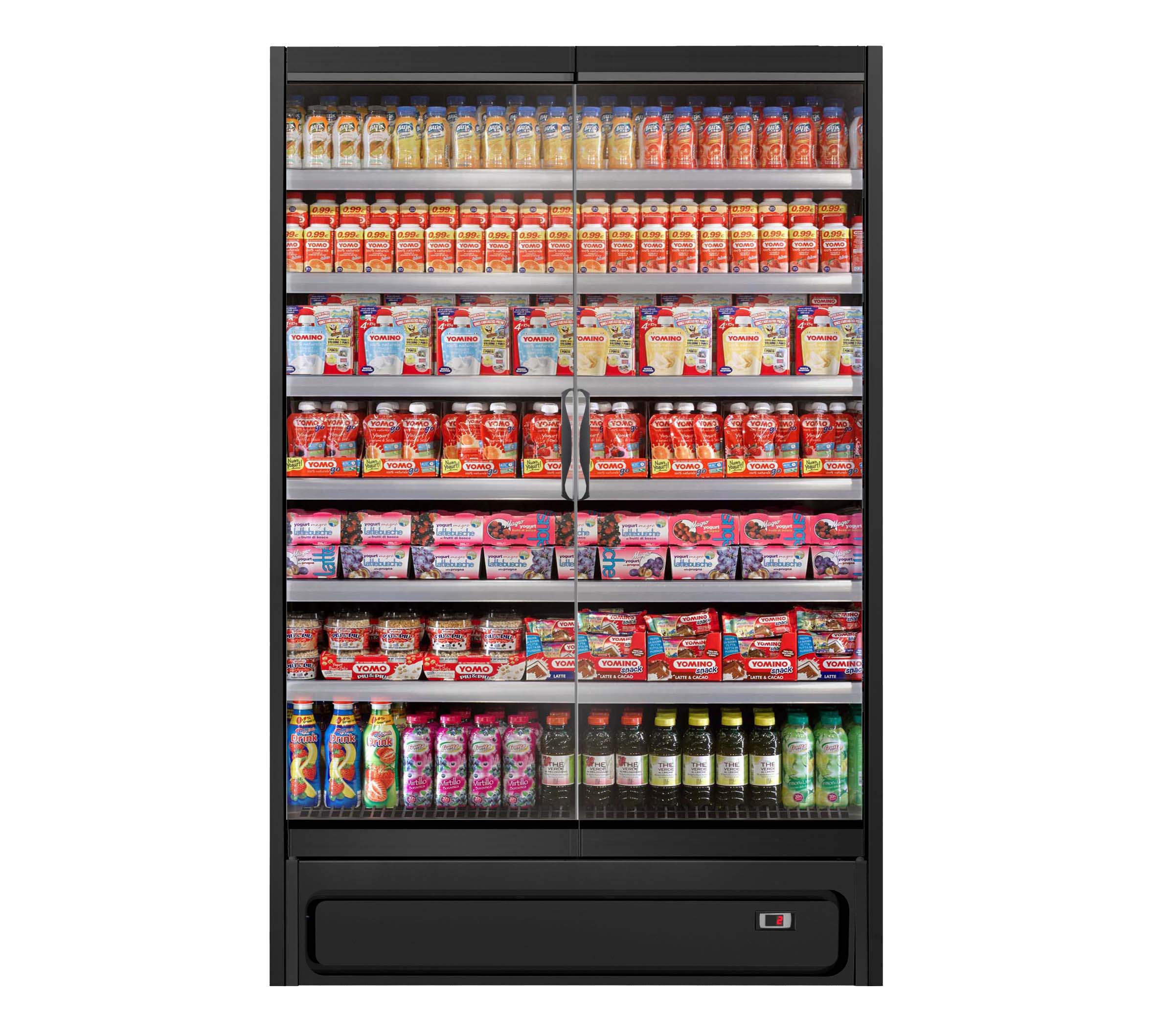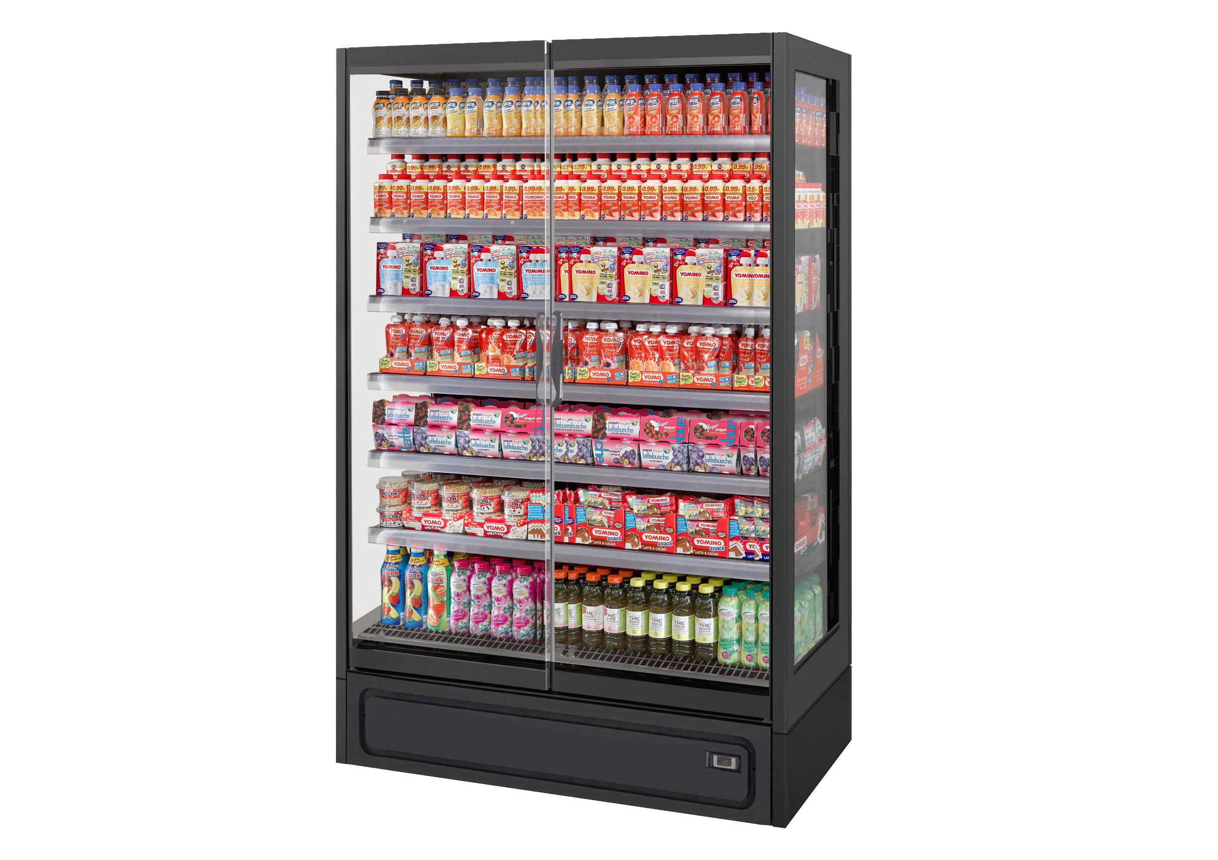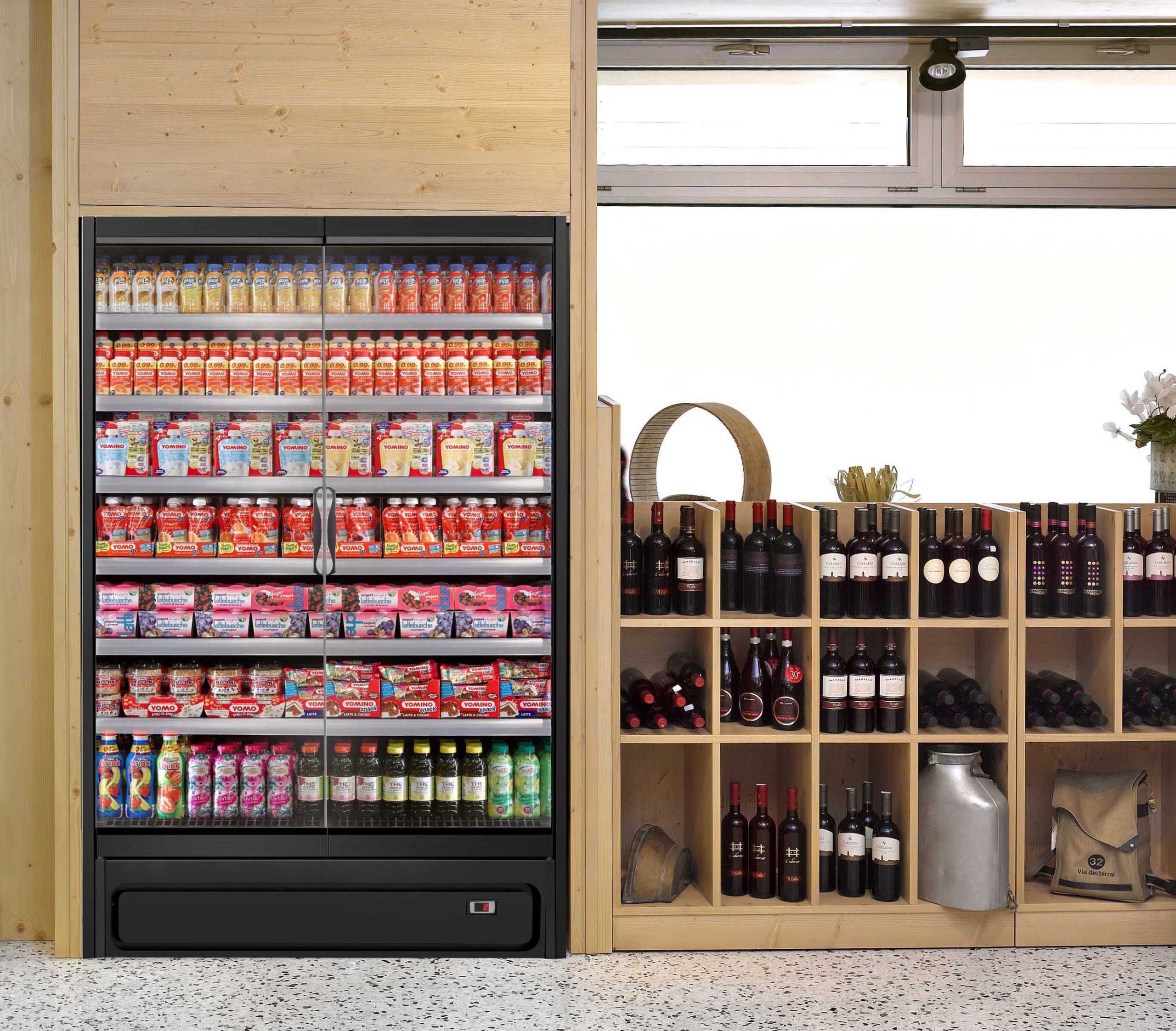 ארון קירור ורטיקלי עם דלתות, פועל על גז קירור פרופאן (R290) ומציג מוצרים ארוזים טריים בצורה מרהיבה. מתאים לכל סוגי החנויות, מקטנות ועד גדולות. מעניק תצוגה מרהיבה של המוצרים הודות לדלתות הזכוכית המלאות ובזכות מערכת תאורה LED.