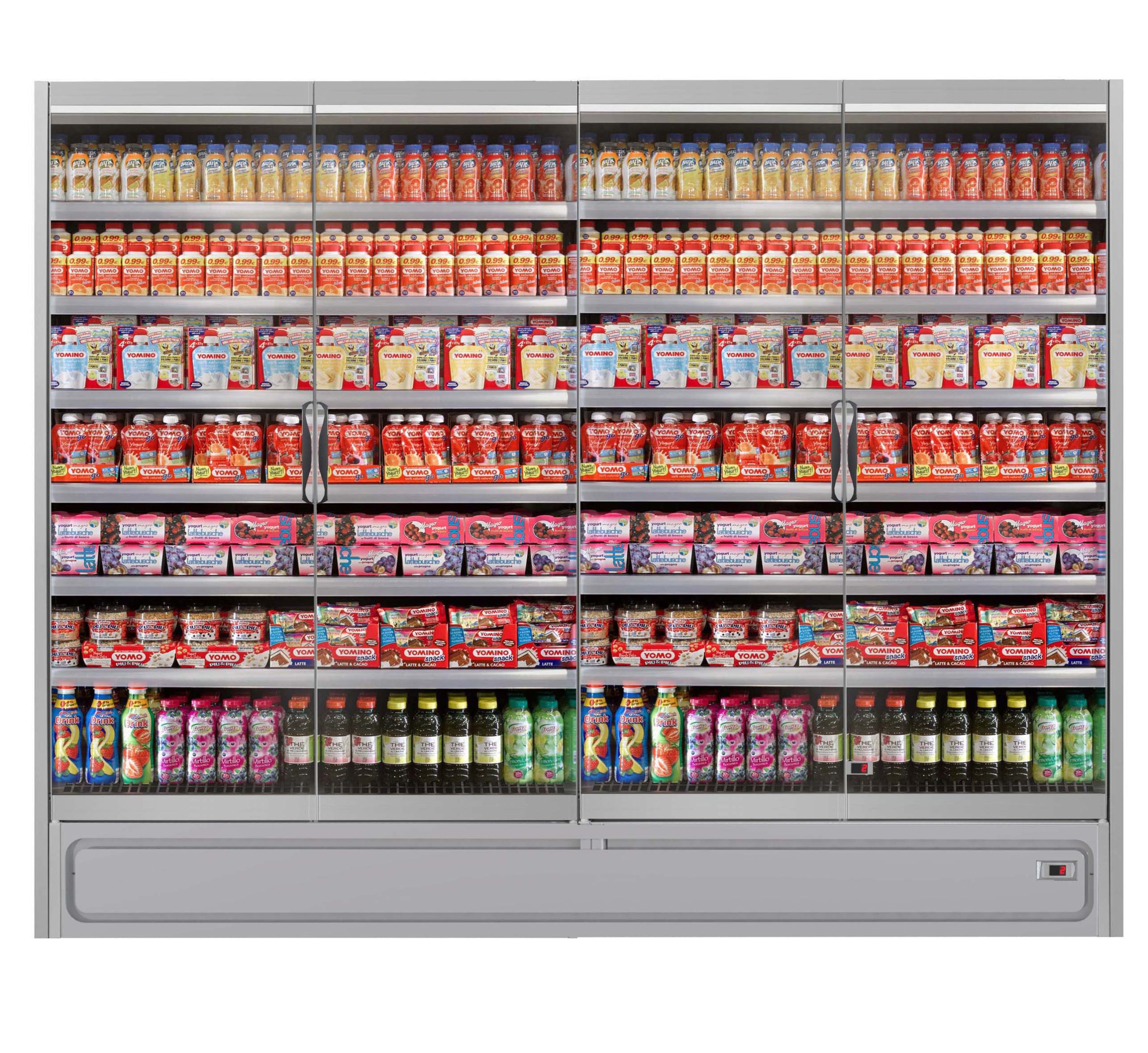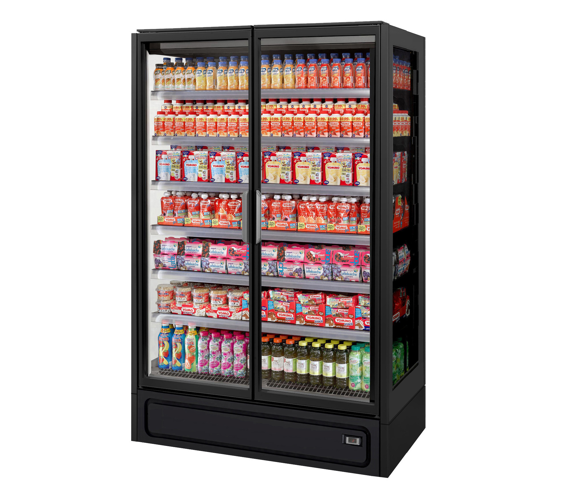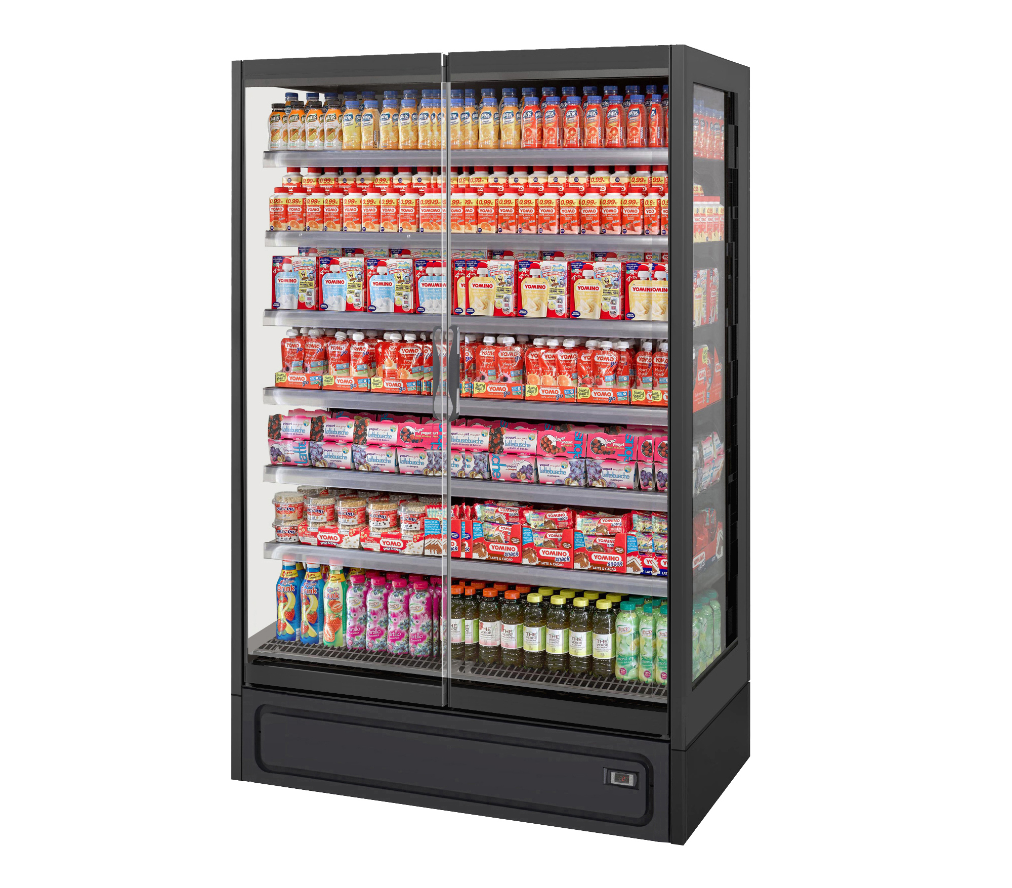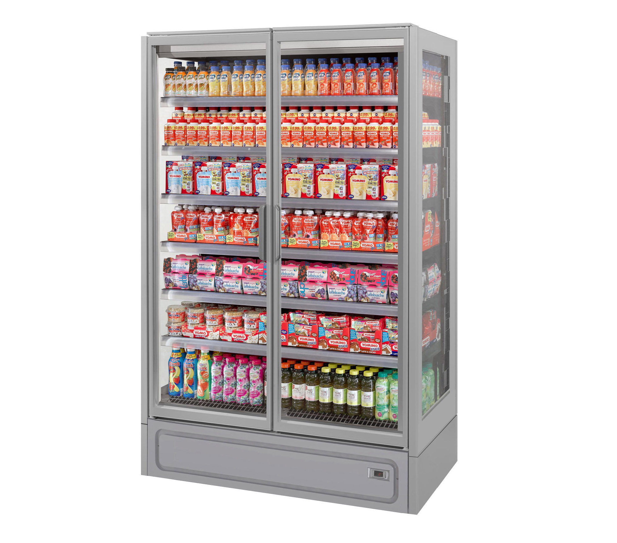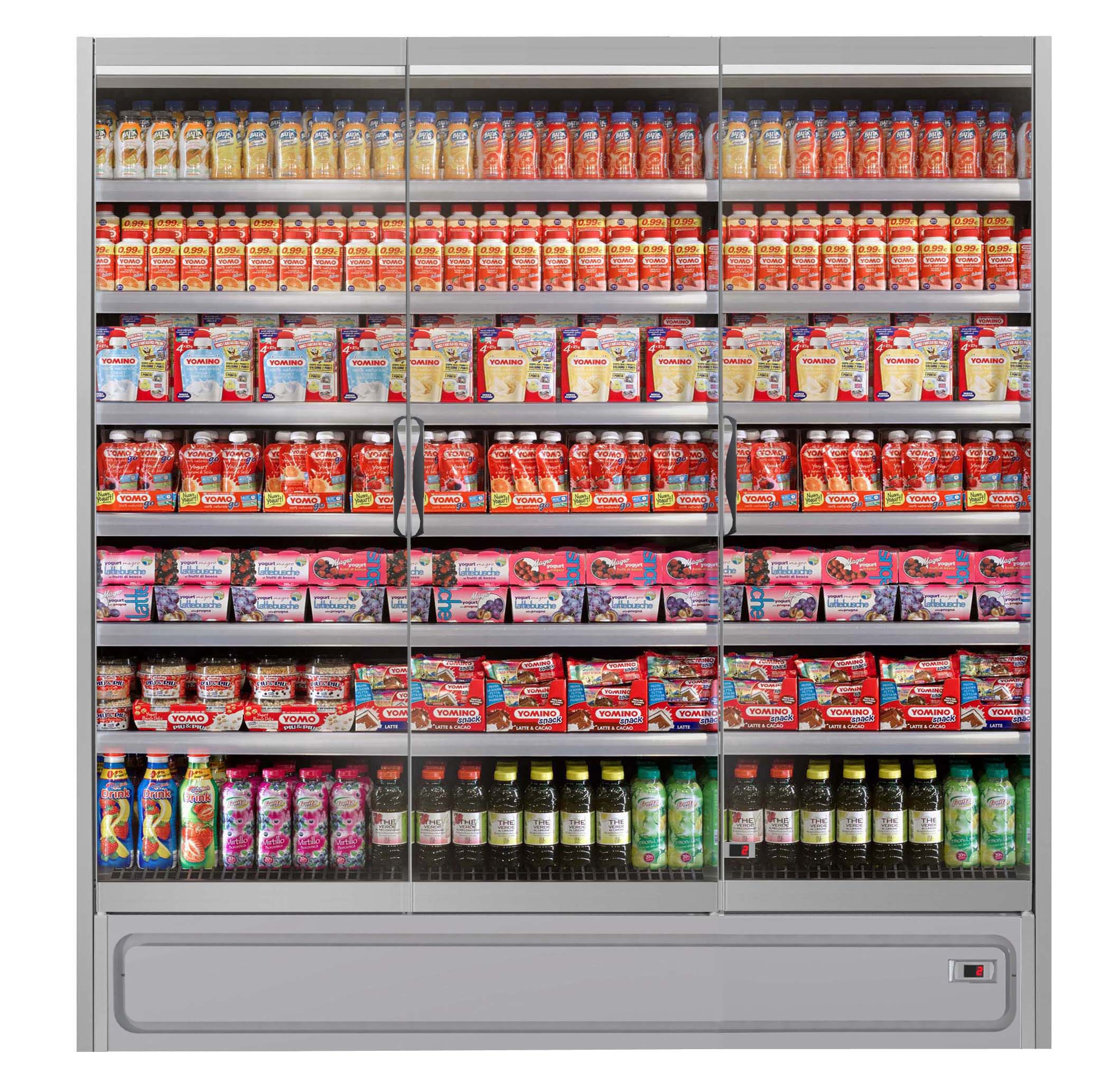 ארון קירור ורטיקלי עם דלתות, פועל על גז קירור פרופאן (R290) ומציג מוצרים ארוזים טריים בצורה מרהיבה. מתאים לכל סוגי החנויות, מקטנות ועד גדולות. מעניק תצוגה מרהיבה של המוצרים הודות לדלתות הזכוכית המלאות ובזכות מערכת תאורה LED.