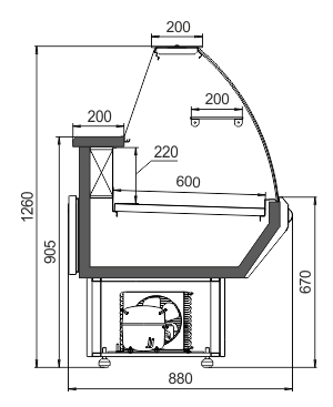 מקרר מעדניה קטן עם חיבור פלאג-אין, עומק הוצאת סחורה 605 מ״מ, קירור סטטי, לוח לפני עם זכוכית ותא קירור נוסף.