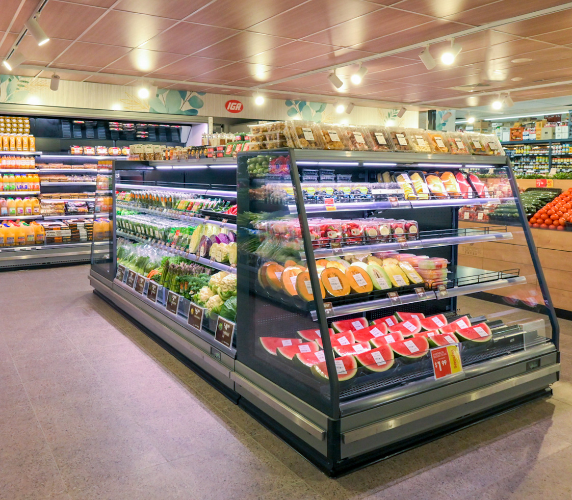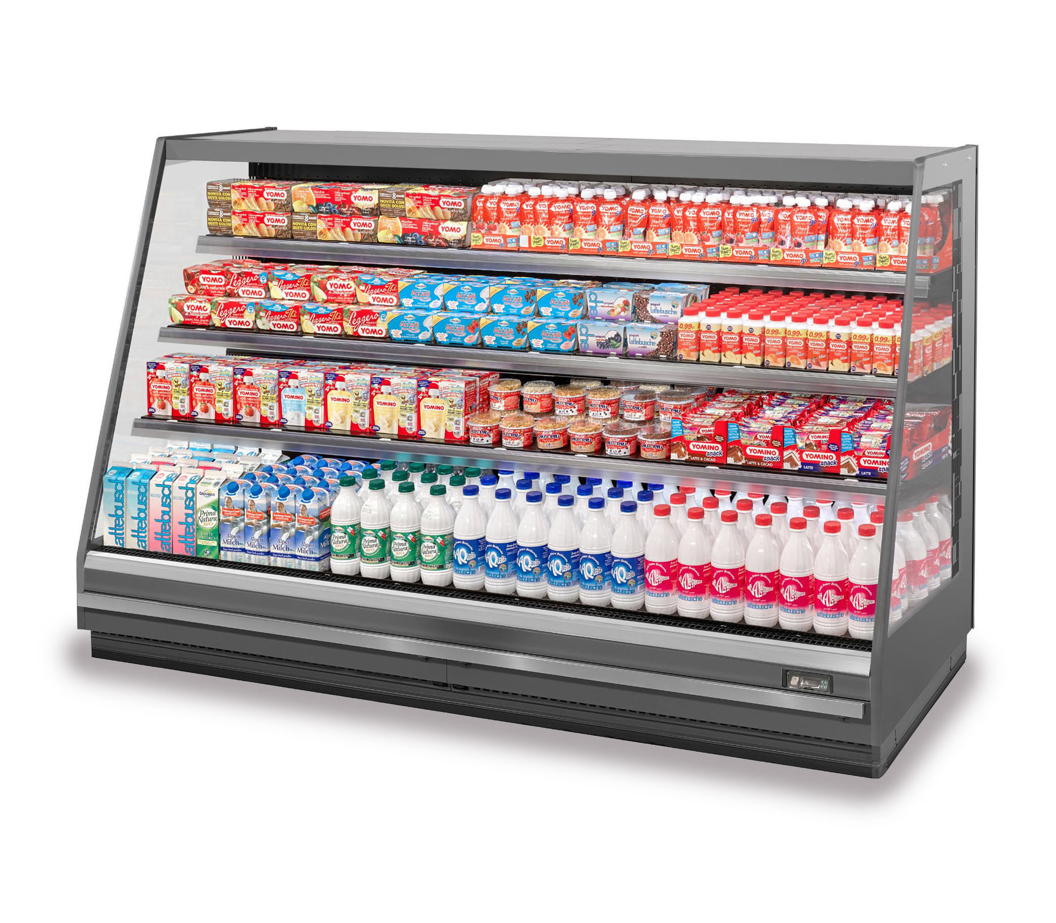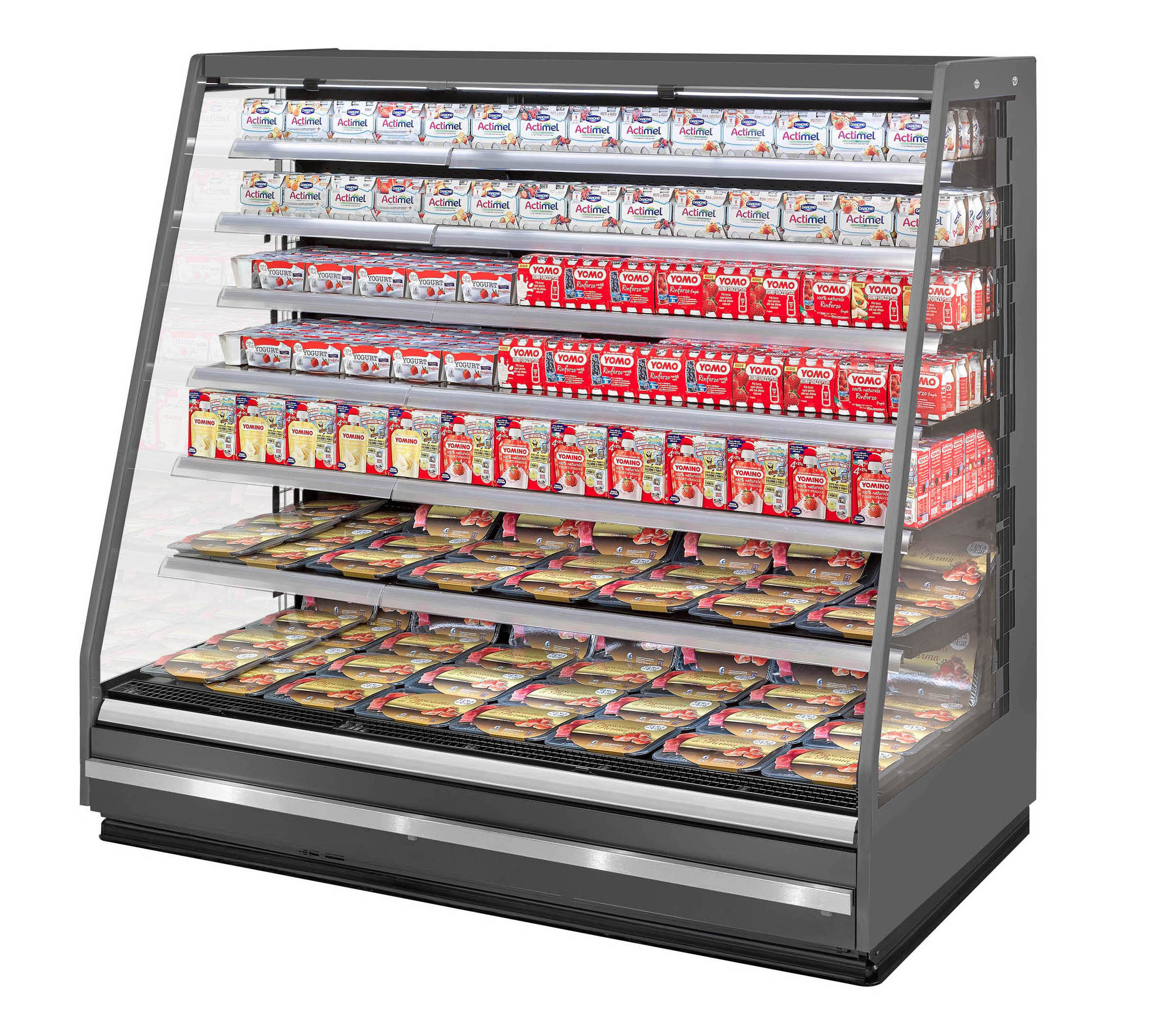 מקרר תצוגה חצי-אנכי פתוח עם יחידה חיצונית למוצרים טריים ארוזים מראש. מושלם לסופרמרקטים והיפרמרקטים, עם צריכת אנרגיה נמוכה ועיצוב אלגנטי שמדגיש את המוצרים המוצגים.