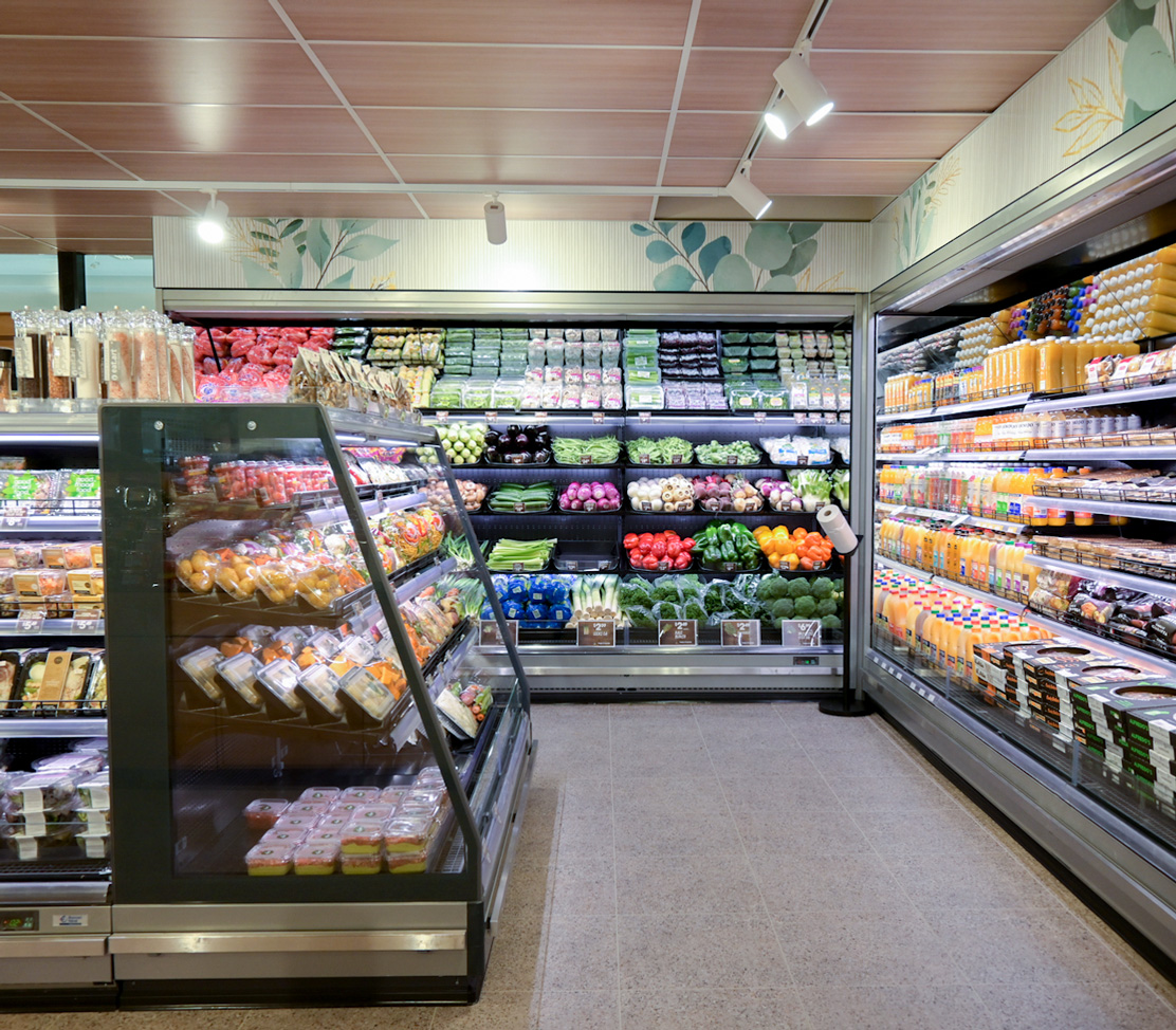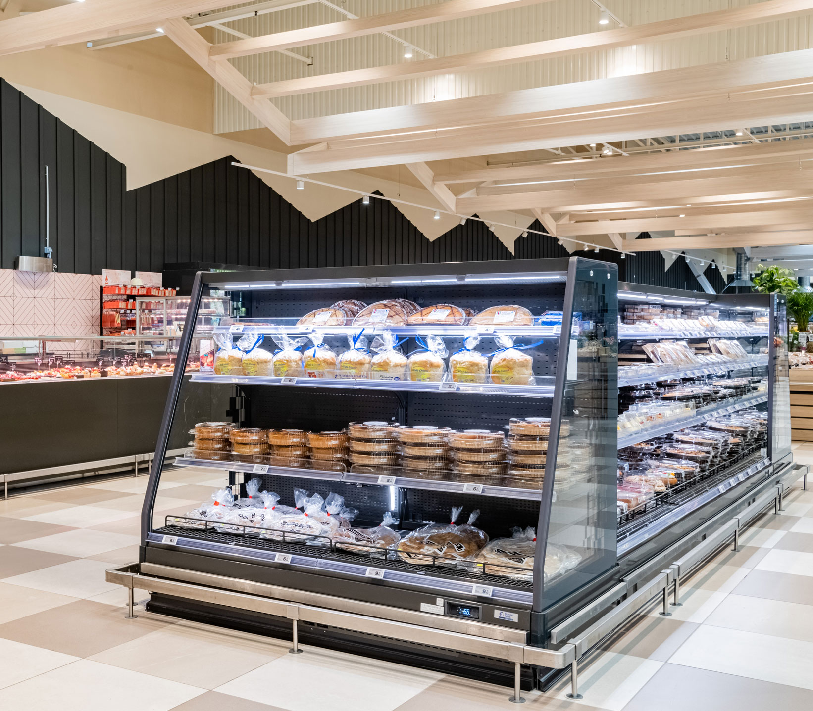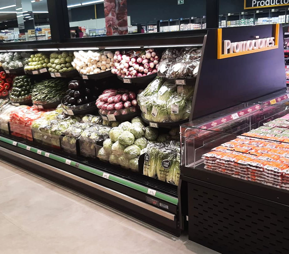 מקרר תצוגה חצי-אנכי פתוח עם יחידה חיצונית למוצרים טריים ארוזים מראש. מושלם לסופרמרקטים והיפרמרקטים, עם צריכת אנרגיה נמוכה ועיצוב אלגנטי שמדגיש את המוצרים המוצגים.